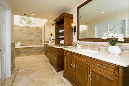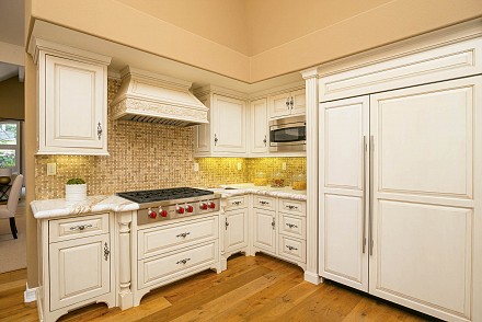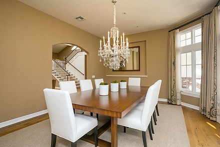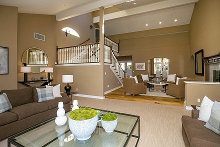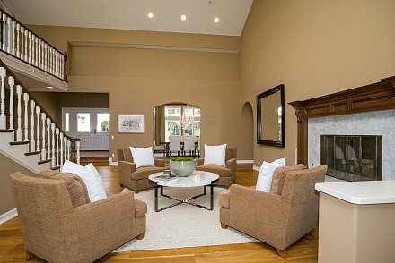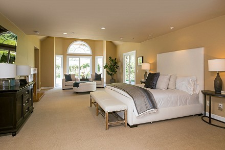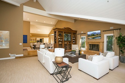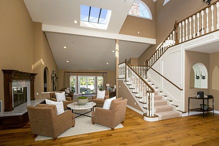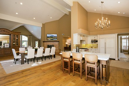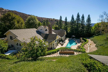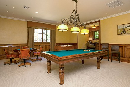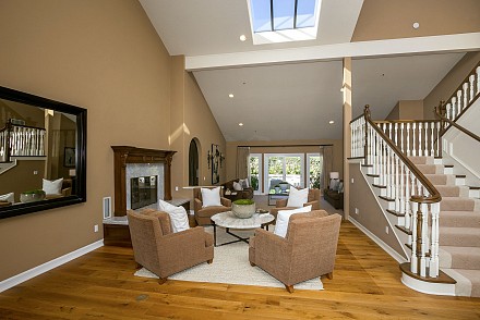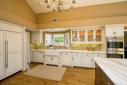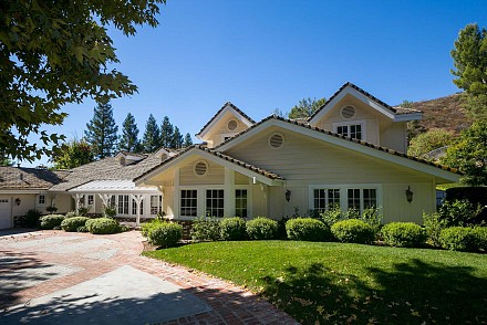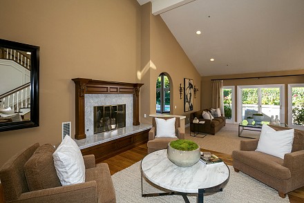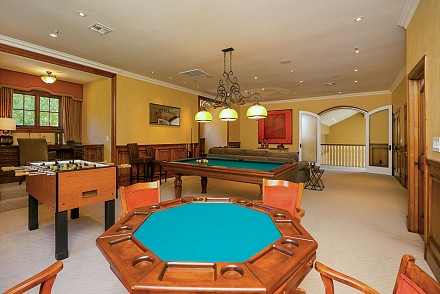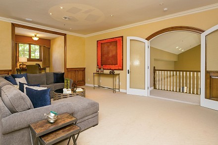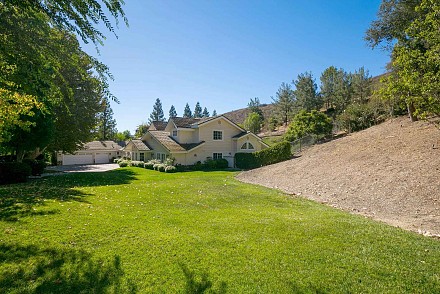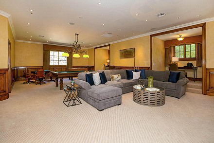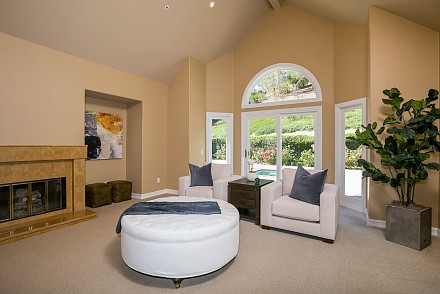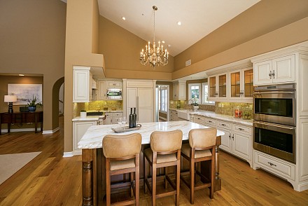 Here, the enchantment is all about space, over 7,000 square feet of sun-drenched beauty. With 20’ ceilings, skylights, and living areas that flow seamlessly together, the home, though spacious, has a warm intimacy about it. Why? Because of the inviting seating/dining areas strategically placed throughout the first floor. Meticulous upgrades add to the beauty, beginning with the country kitchen: granite countertops and island, apron sink, Wolf range and double ovens, lattice-tile back splash. The adjoining breakfast area overlooks a gorgeous family room, with generous windows facing the hills. Just beyond is the living room, again with soaring ceilings, and handsome fireplace. The informal dining/sitting room, with recessed lighting, has a fireplace of marble, as does the “gathering room,” which is near the foyer. A guest room/maid’s quarters, with full bath, is on this end of the ranch-style home, as well as a spacious laundry room.
