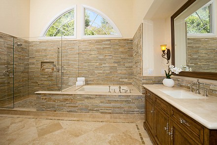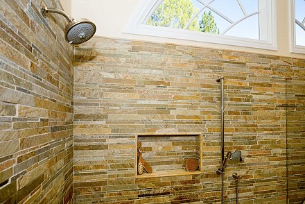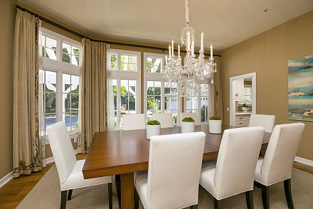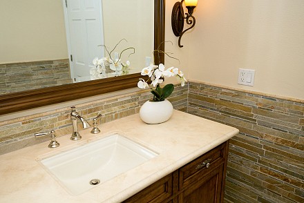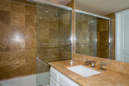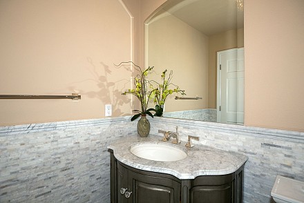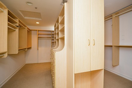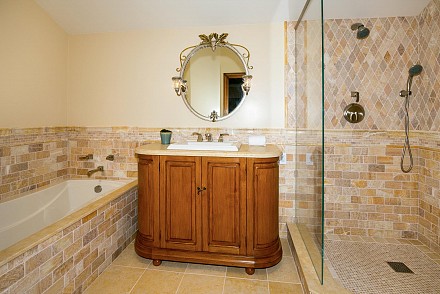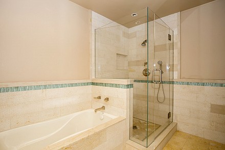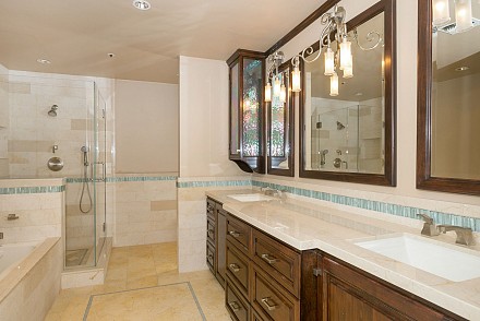 All of the bedrooms are on the first level, with four of them at the end of a wide hallway. One guest room has an en suite bath, and a door leading to a private patio. Two other large guest rooms, both with a wall of windows, share an especially exquisite bathroom, with ridged, aqua tiling. The upgrades are particularly evident in the bathrooms, especially the master bath, with ledge-stone walls, an over-sized shower with multiple showerheads, and spa tub. The custom closet is divided into two parts, with two dozen built-in drawers, enough room for any shoe collection! Storage is plentiful throughout the home.