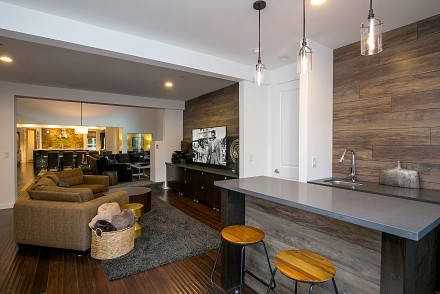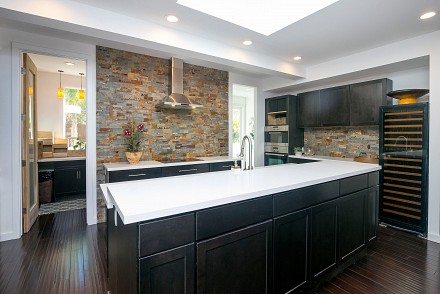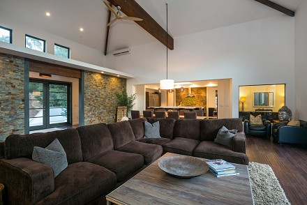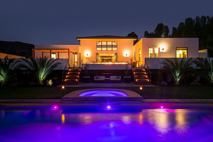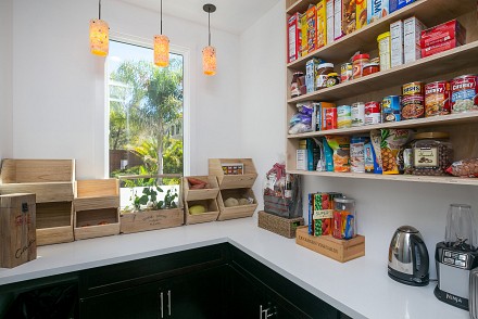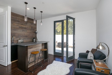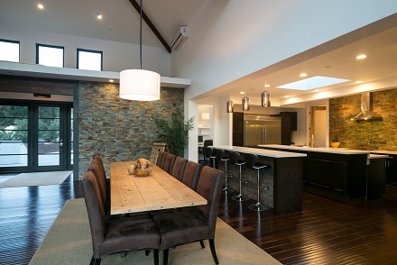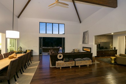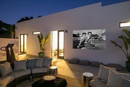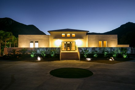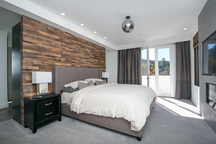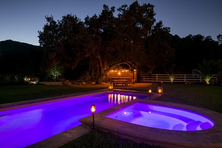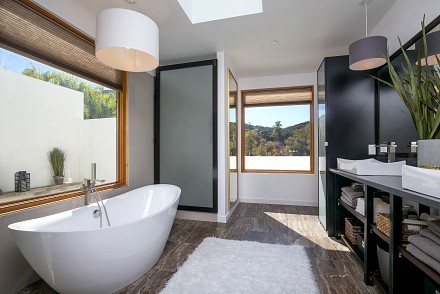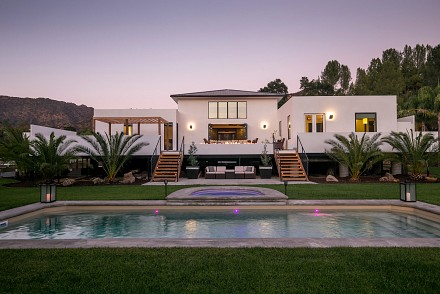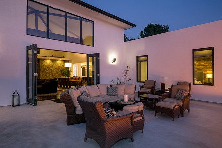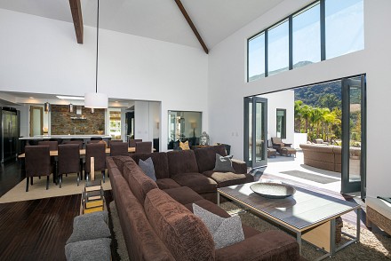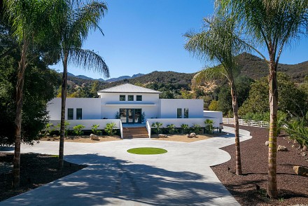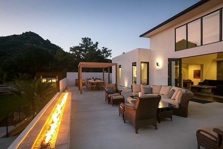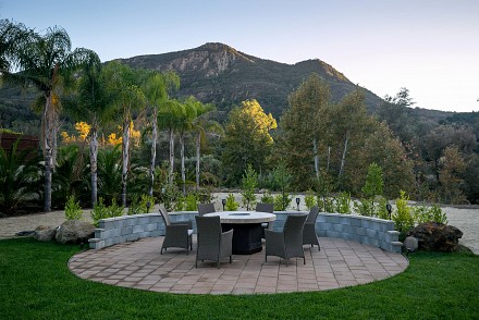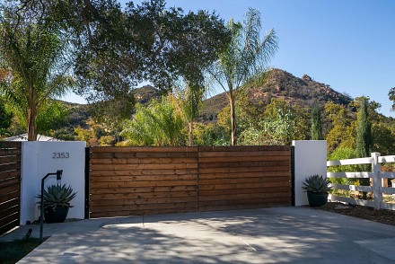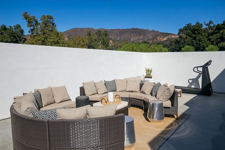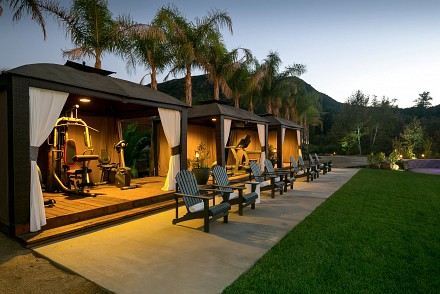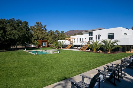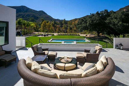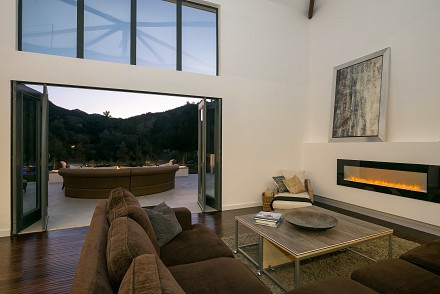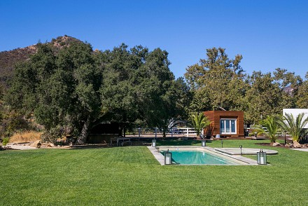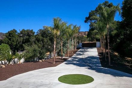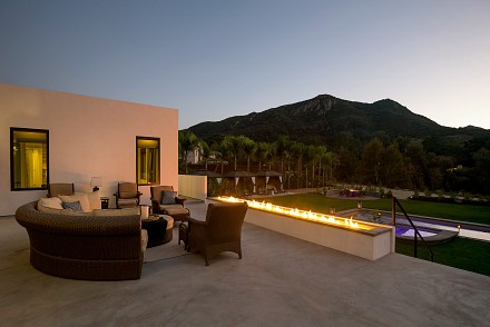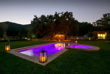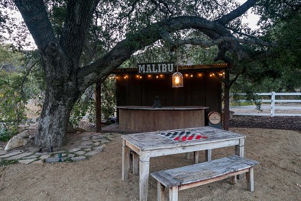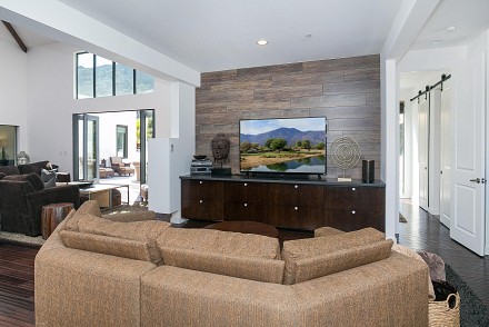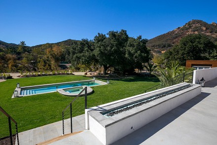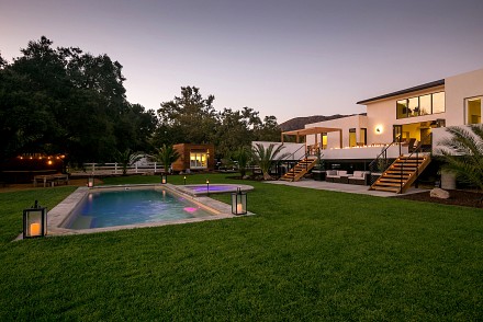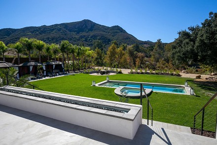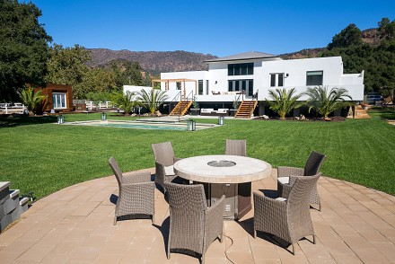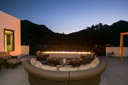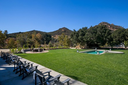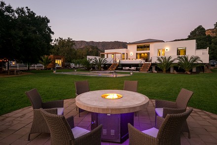 Just lie back in one of the lounges at Cabana #3, gaze at the majesty of the mountains in the distance, study the beams of sunlight glittering across the blue of the pool and spa…yes, this is close to perfection. If ever there was a home in the valley of the Santa Monica Mountains that can offer owners a Zen experience, this is it. The builders, designers, decorators put it all together, leaving nothing to chance --- in order to create a property that will satisfy the demands of the most scrupulous buyer. 46 canary palms, 37 Queen Ann palms, and 6 olive trees have been planted along the front and back of the 2-plus acres, along with 50 cherry trees on the back perimeter, all on irrigated drip systems with timers. The pool and spa are situated in the middle of a 7,000 sq. ft. grassy area, with 360-degree views of the mountains. Three cabanas lie on one side of the yard, with a dining table and firepit close by, and on the other, a charming studio/gym/play room, made from recycled barn wood. Along the back patio is a 20’ long propane glass and volcanic rock fireplace, and the side of the home is configured so that it can become a 12’ movie wall, with plenty of seating for guests.