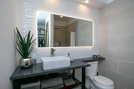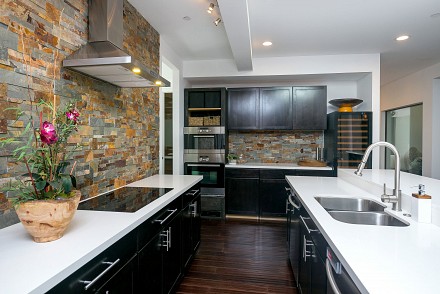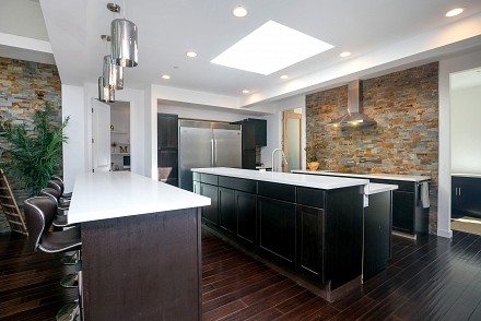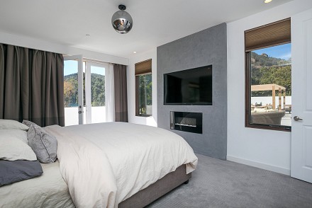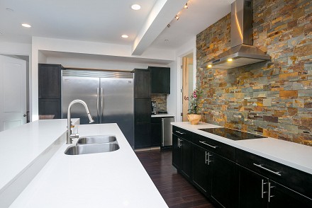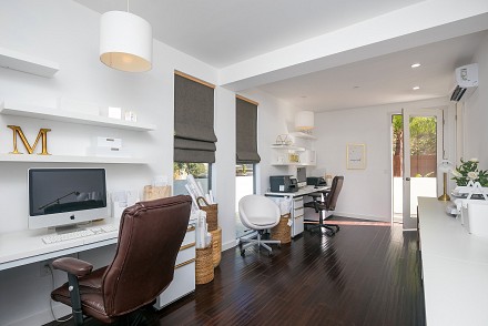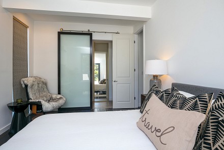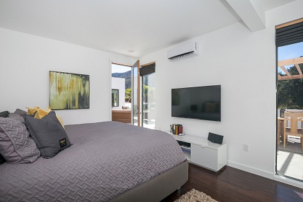 And that is just the outside! The architecture is sleek, clean, modern, white; but as you walk through the rooms, there is a sense of tranquility and calm: bamboo flooring, stacked-stone and barn wood walls of gray and beige, accordion doors looking out towards the pool. The open floor plan is ideal, with a kitchen having a double-island of quartz, professional refrigerator, double dishwasher and oven, wine fridge, and walk-in pantry. This area is light and efficient, a chef’s dream! Adjacent is the great room, with 20’ open-beamed ceilings, bar with fridge, and fireplace. A large laundry room and powder room, with efficient mudroom, is perfect for cleaning up after an afternoon of sunbathing. The master bedroom is flawless: fireplace, bath area with skylight and soaking tub, large his & her showers. Both guest rooms have en suite baths, one with barn doors to the walk-in closet, one with blue-tooth mirrors and stackable washer/dryer. The office can also be a 3rd guest room.