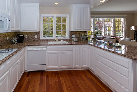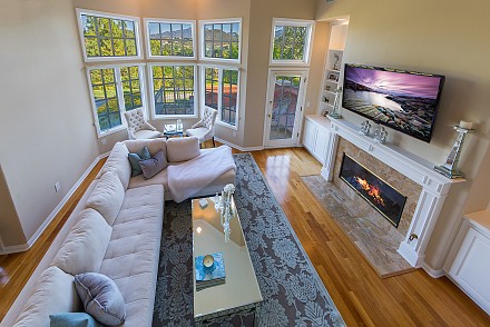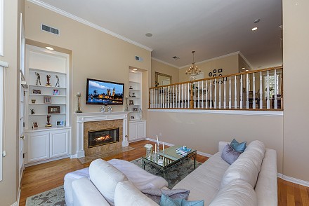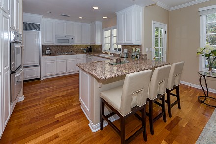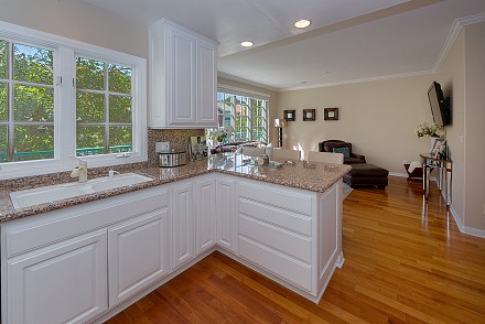 The floors on the first level are a rich wood, which accents the open living room, boasting a marble fireplace, high ceilings, and a wall of windows facing the mountains. A French door leads to a charming patio. The kitchen is white and bathed in light: upgraded custom cabinetry, granite counters and bar. The kitchen opens to a family room and deck. The dining area is loft-like, with, again, sumptuous views.