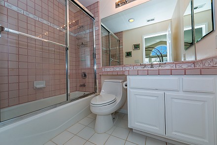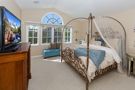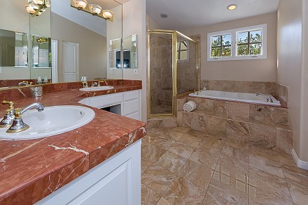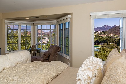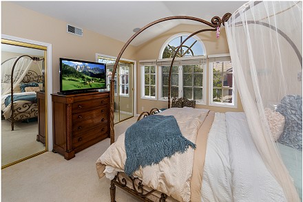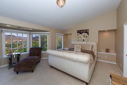 The master bedroom, with en suite bath, illustrates the meticulous attention to detail, with its sitting area overlooking bay windows, built-in nooks on either side of the bed, and oversized marble bathroom. The guest bedroom has two closets and, of course, those mountain scenes!