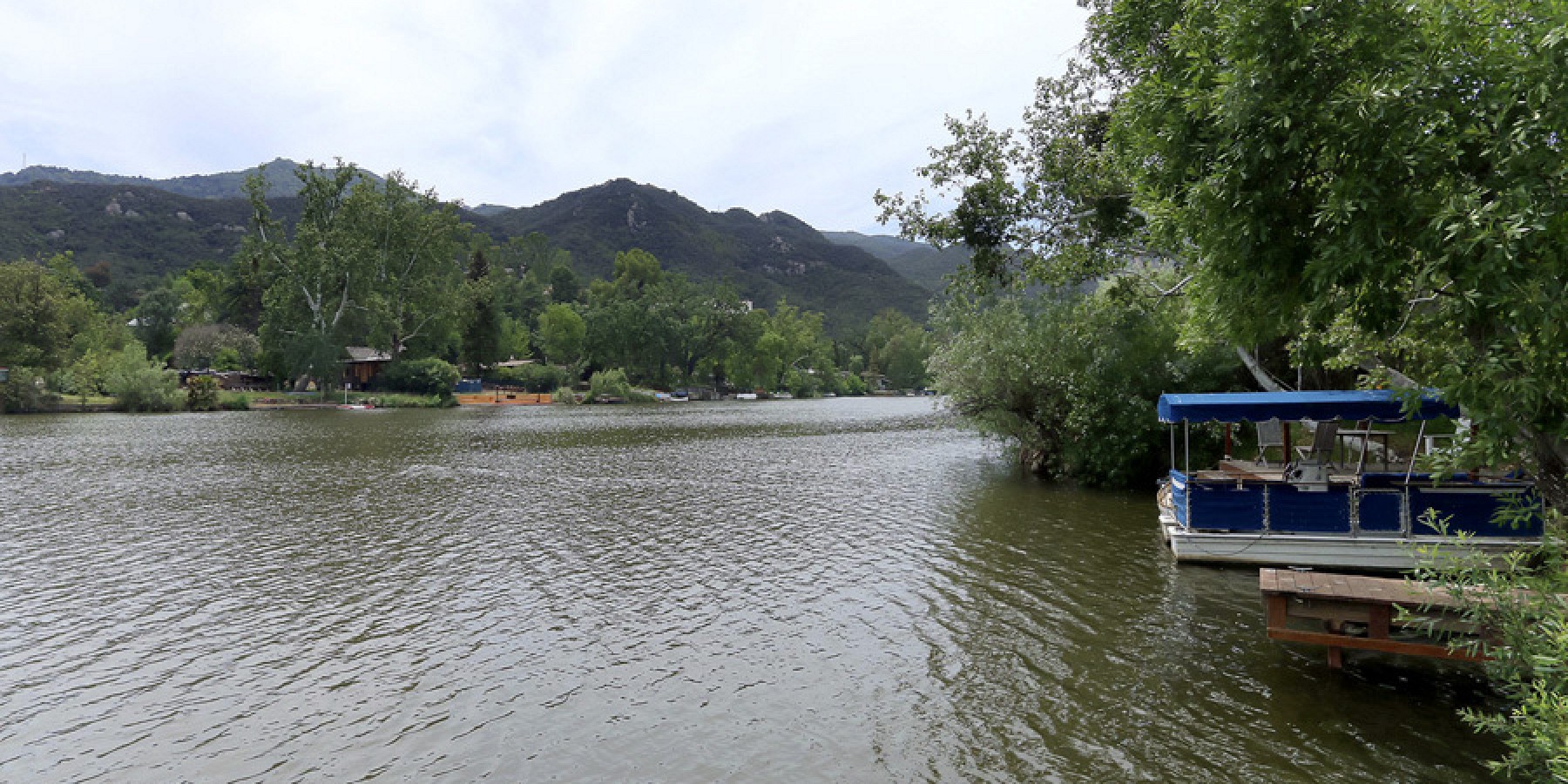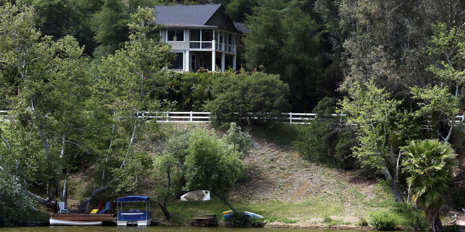 The next level has two guest baths and three guest bedrooms, with bleached pickle-pine floors, huge vaulted ceilings, and several closets. The other end of this floor is the master suite, with a giant walk-in closet (once a bedroom), and a wall of built-in bookcases and desk. Another wall of windows faces the lake, with a charming sitting area and fireplace. An enclosed porch/office looks onto the Santa Monica conservancy, with jaw-dropping vistas. The en suite bath also has lake views. It’s truly hard to be “pulled away” from this delightful sanctuary!