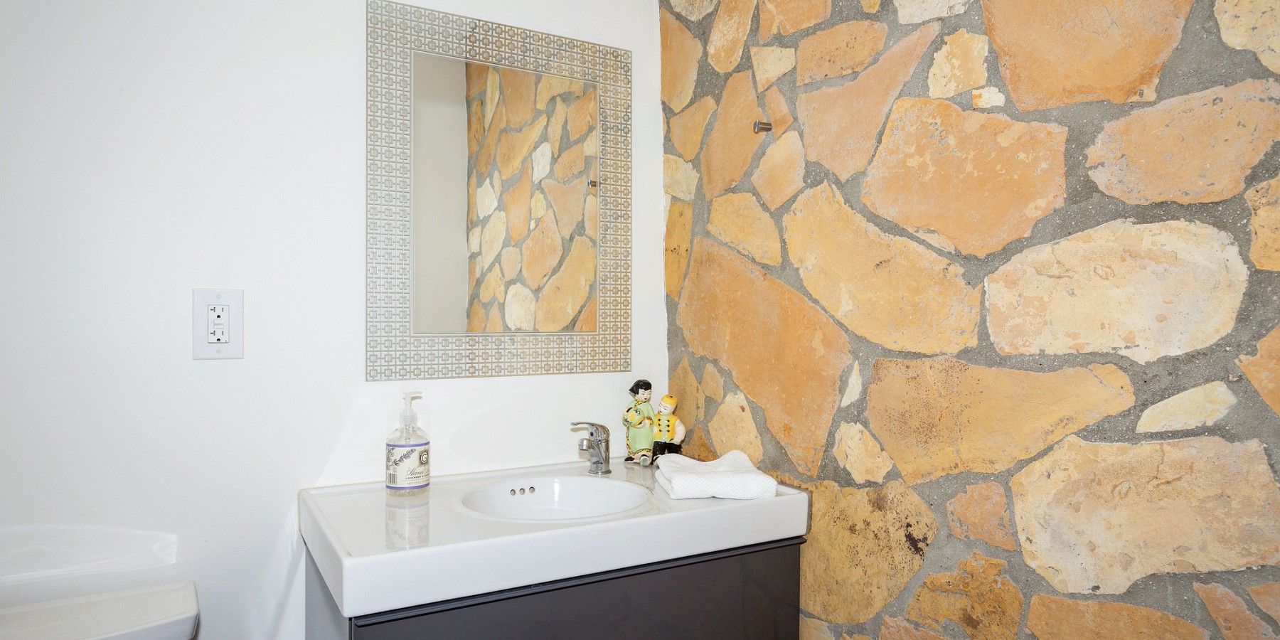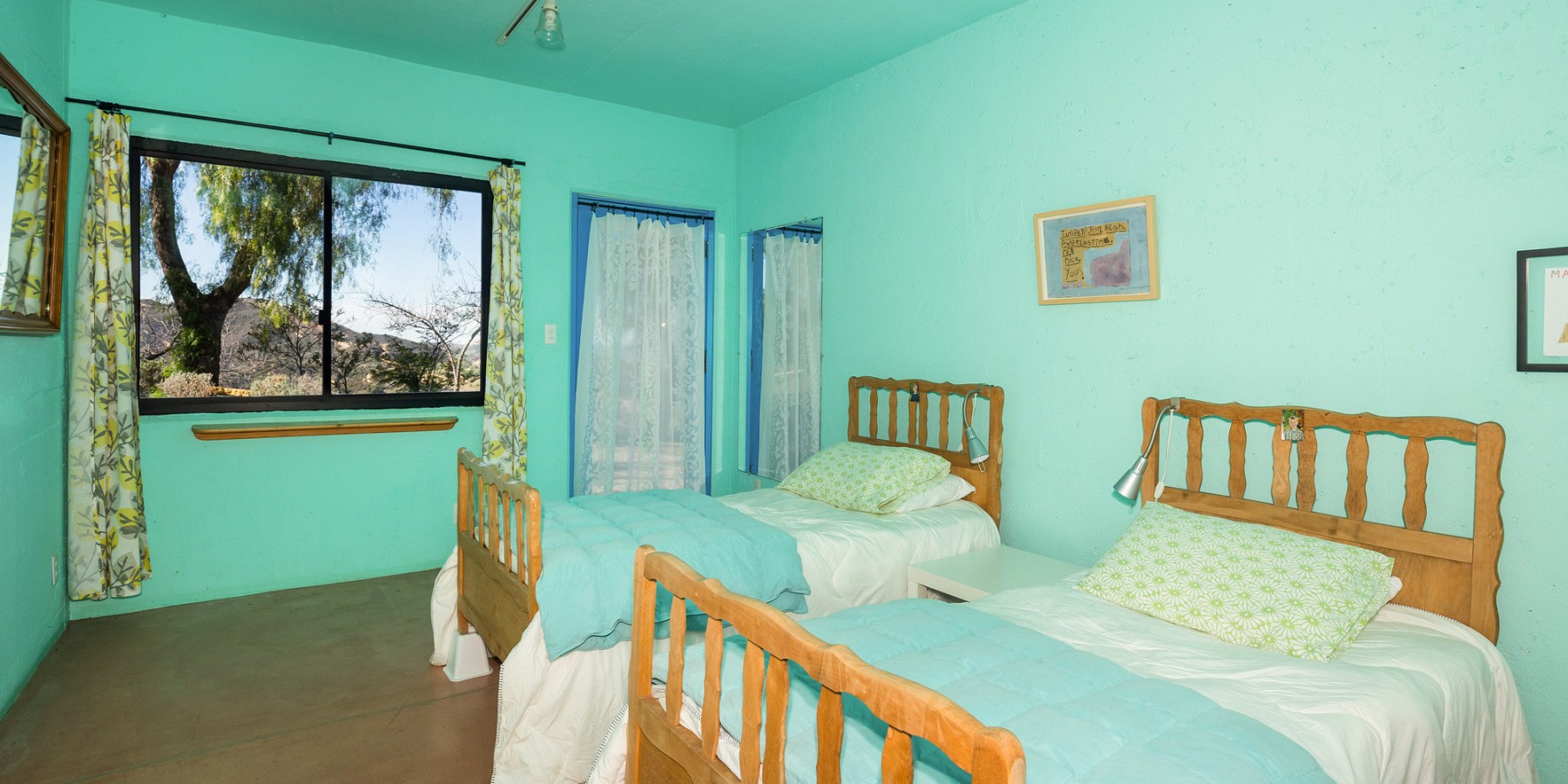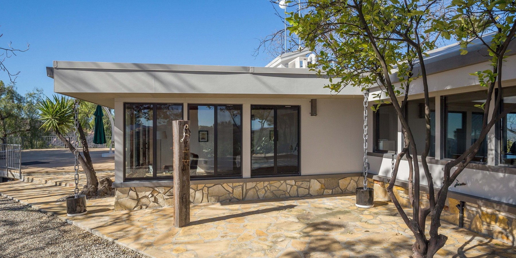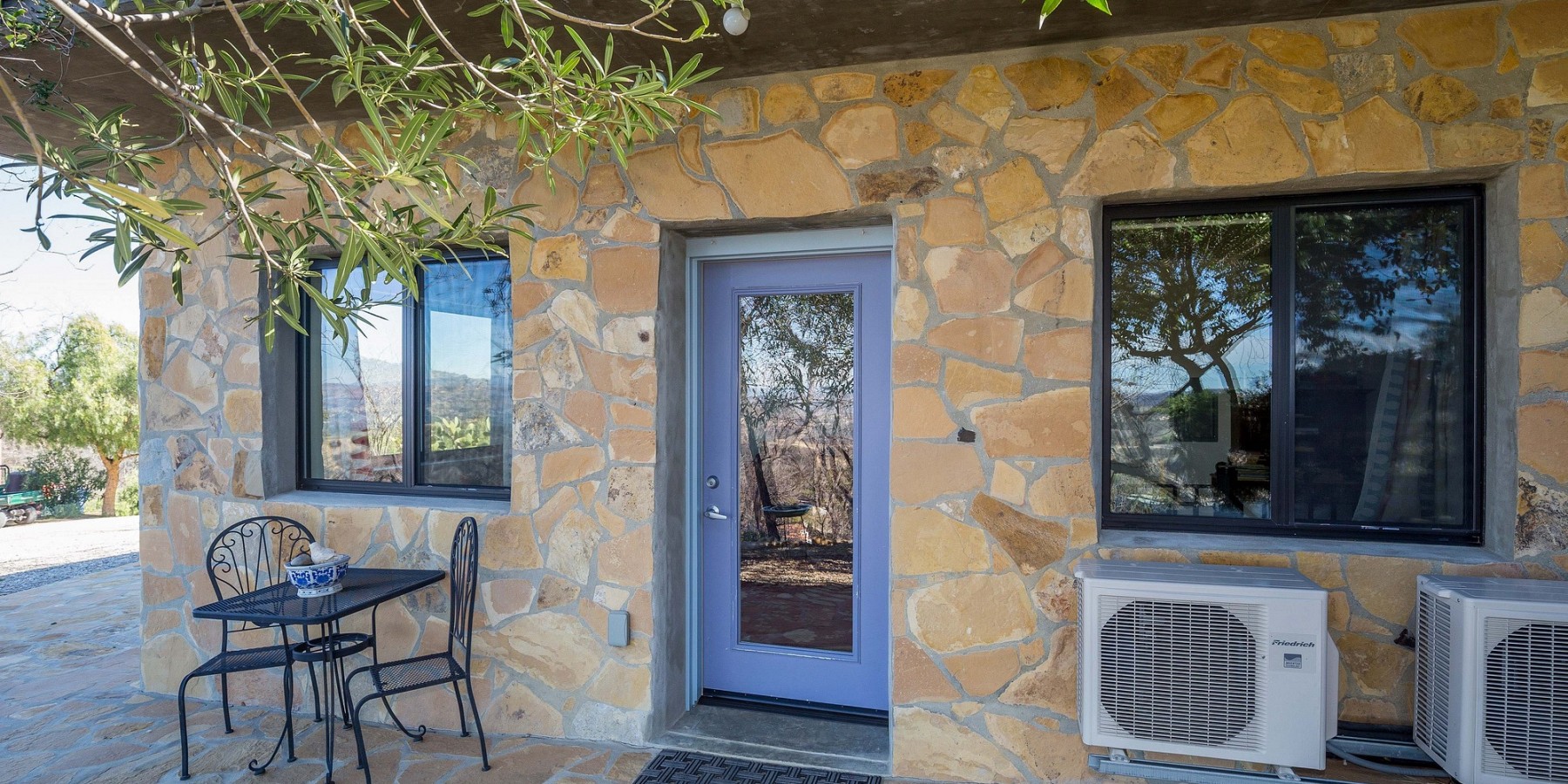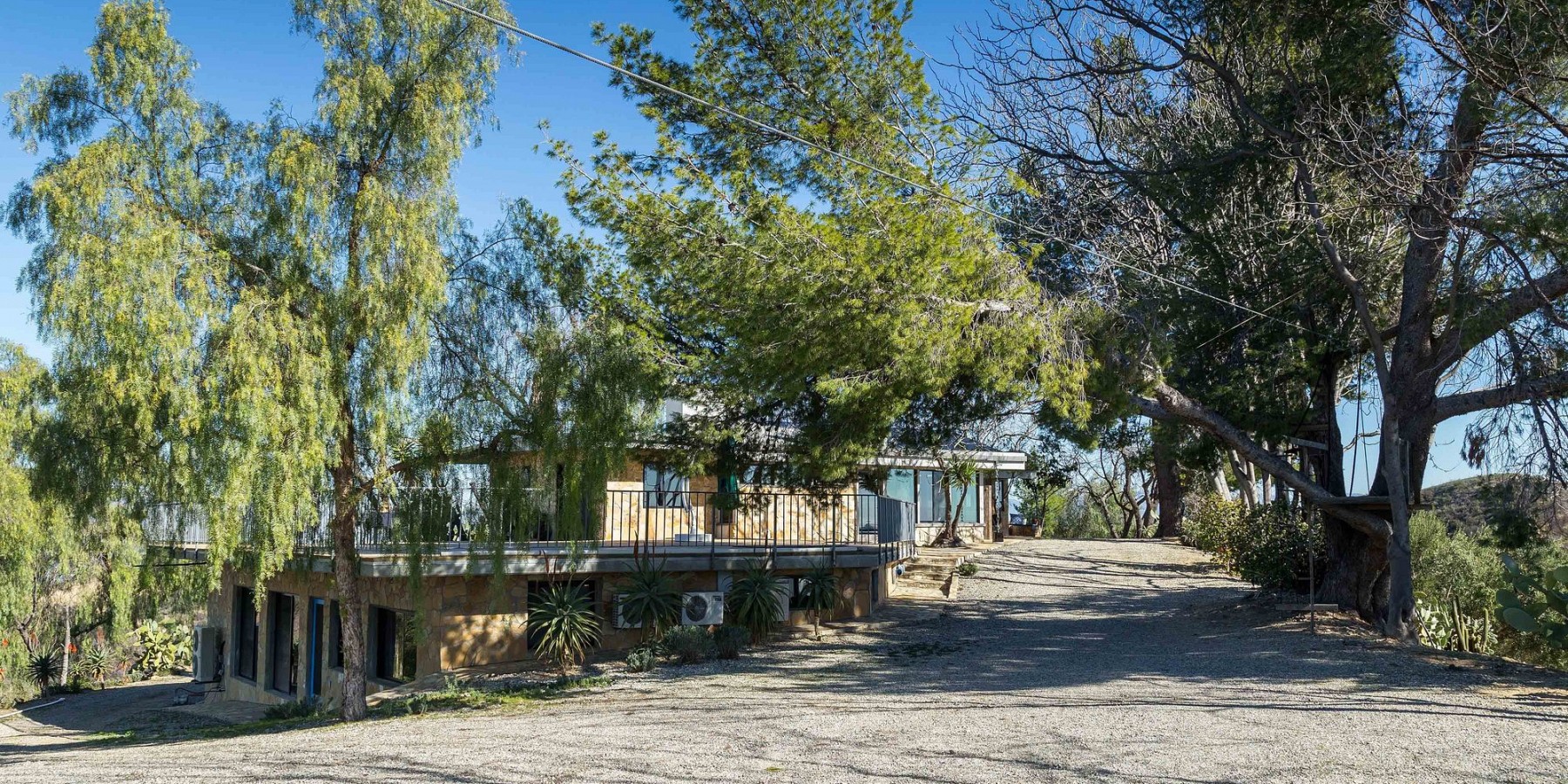 Solar powered and constructed mostly of reinforced concrete and fire resistant materials, the structures nestle into the hillside and blend into the surrounding landscape, discretely disguising their generous floor plans. Two view decks, large enough to host a couple hundred people for any festive gathering enjoy magnificent sunrise and sunsets. Sandstone slabs quarried right from the site are abundantly used around the beautifully situated swimming pool, on the exterior walls of the home, and on various patios and walkways. They contain many fossils to discover and blend harmoniously with the landscape. Water saving lavenders and olive trees complete the Mediterranean feel.