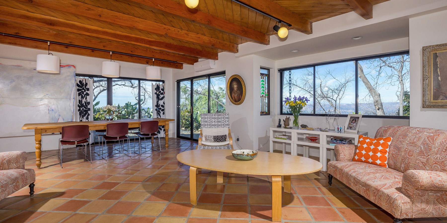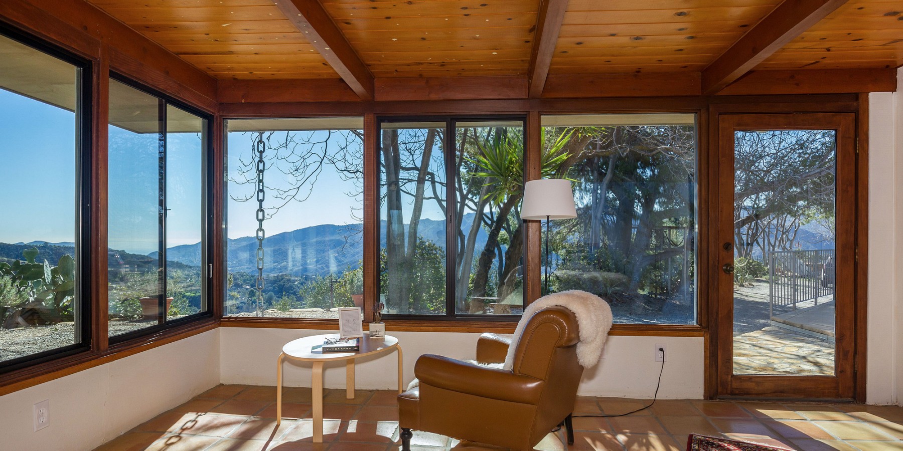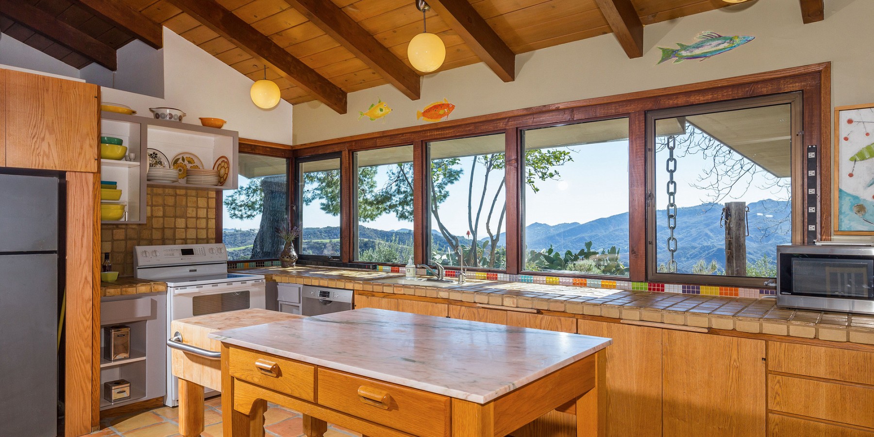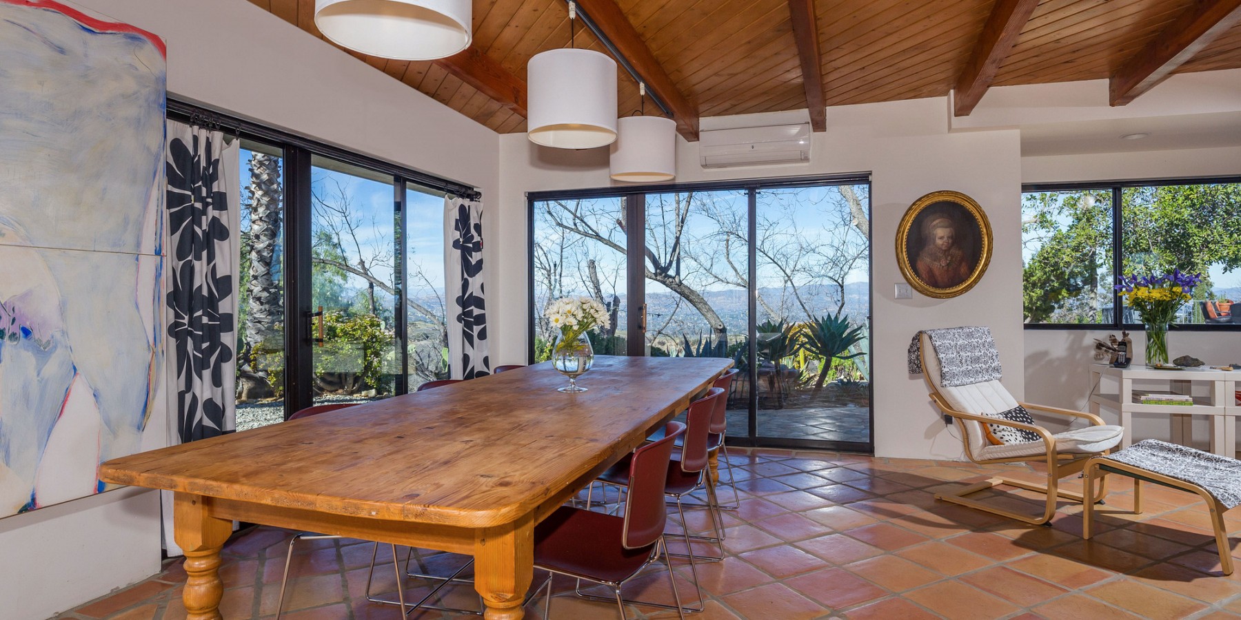 The lower level holds a large, central sitting room, two spacious bedrooms, and a full bath, all with views of the mountains and valley, of course! A few steps further down is a massive sun-drenched workshop, a car collector’s or artist’s dream with floor-to-ceiling sliding glass bay doors overlooking the Canyon and the San Fernando Valley beyond.