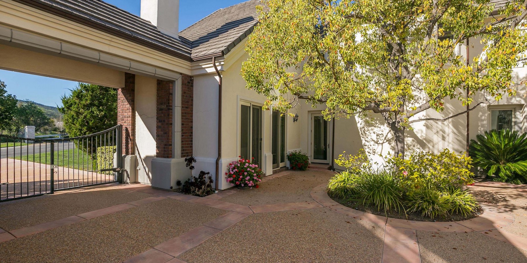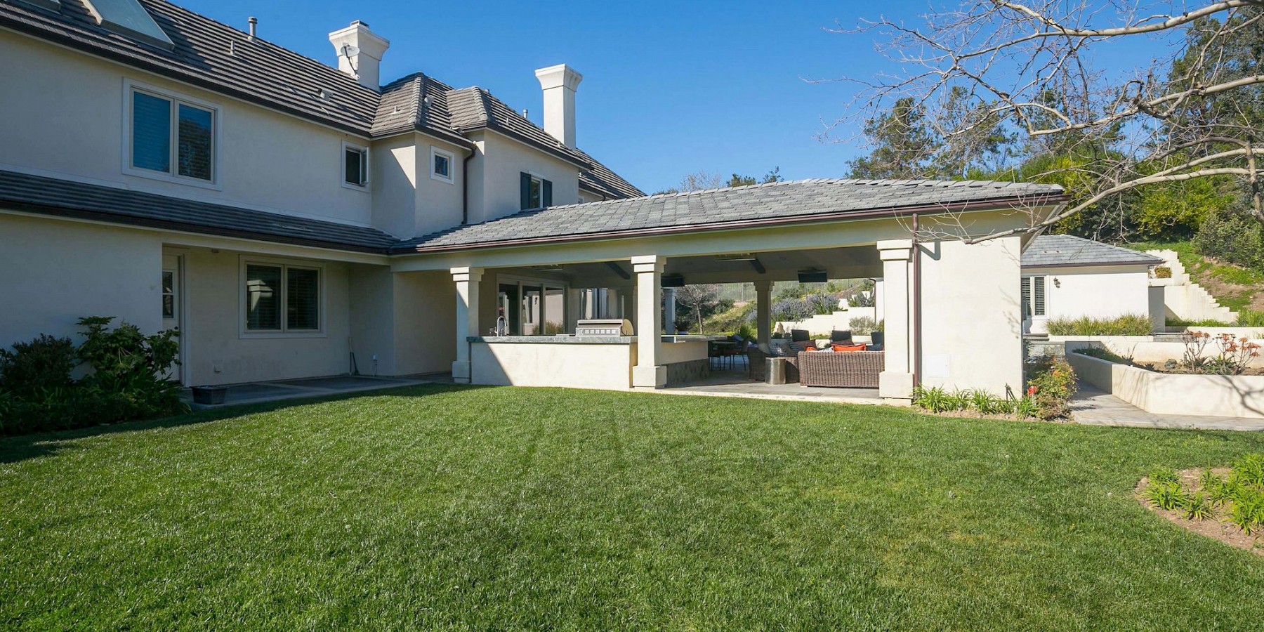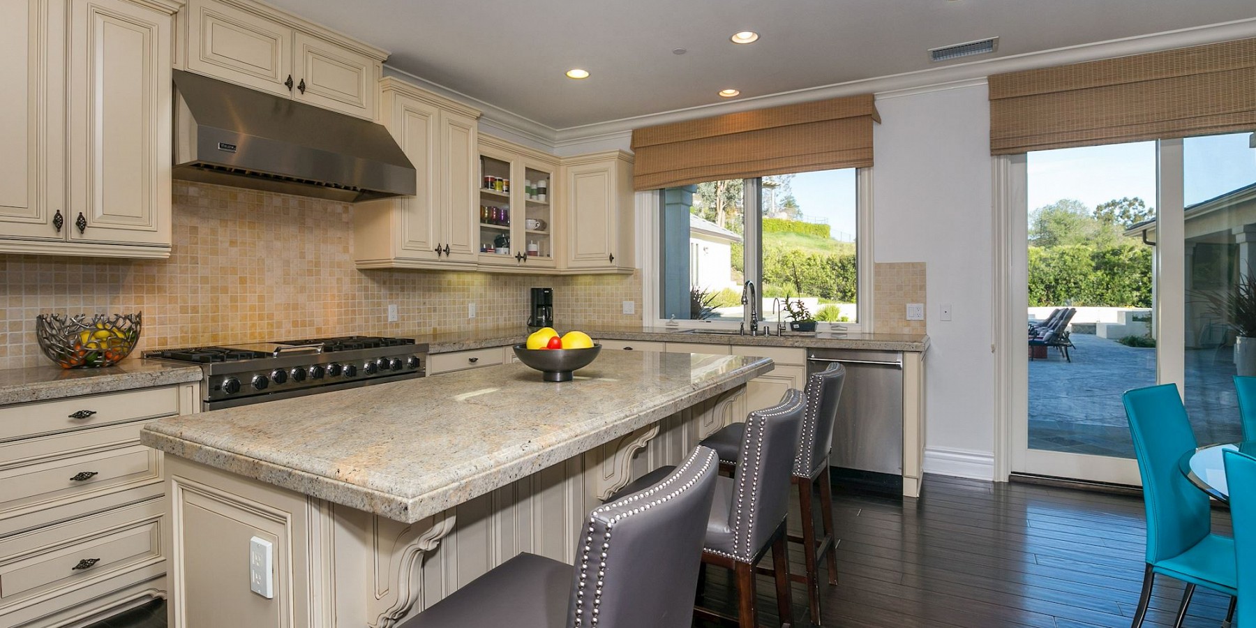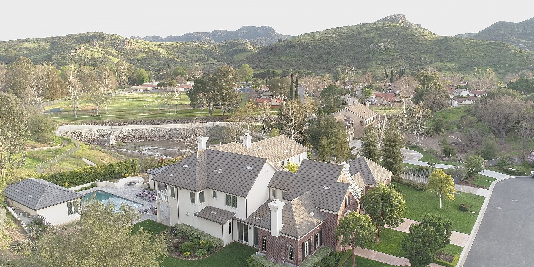 These words by the English novelist might well have been said about another countryside “touch of beauty” – right here in the heart of the Conejo Valley. After you’ve driven through the private-gated community, then reached the home itself, the red-brick portico and acre of regal landscaping, makes one fantasize about arriving in the rolling countryside of Oxfordshire! And if that suits your fancy, then it’s time to play a game of pool in the gorgeous billiard room, complete with darkwood floors, handsome fireplace, and coffered ceiling. The elegant kitchen is another area reminiscent of the graceful lifestyle of a British manor, with its chef stove and refrigerator, custom moldings, and butler’s pantry.