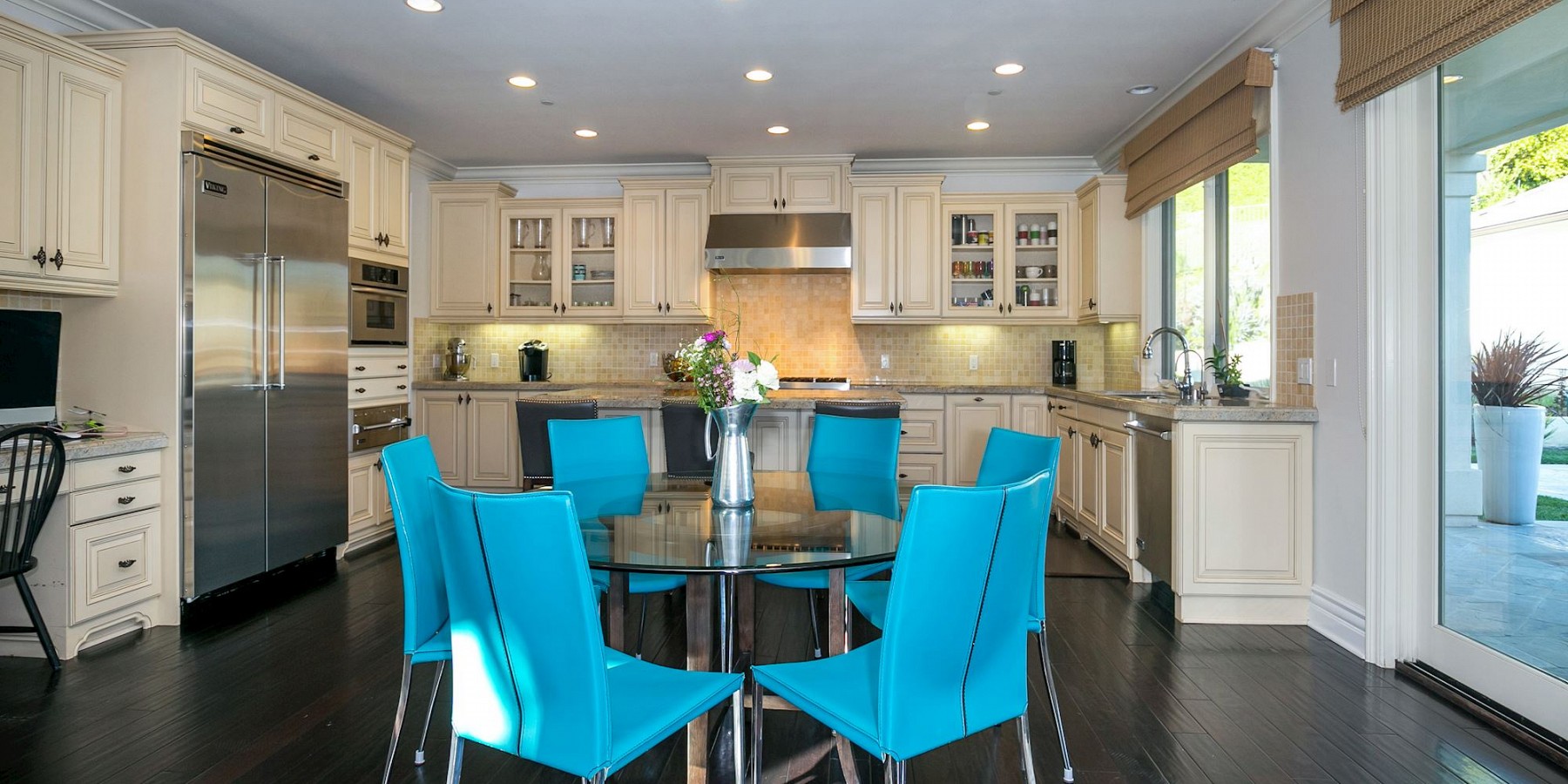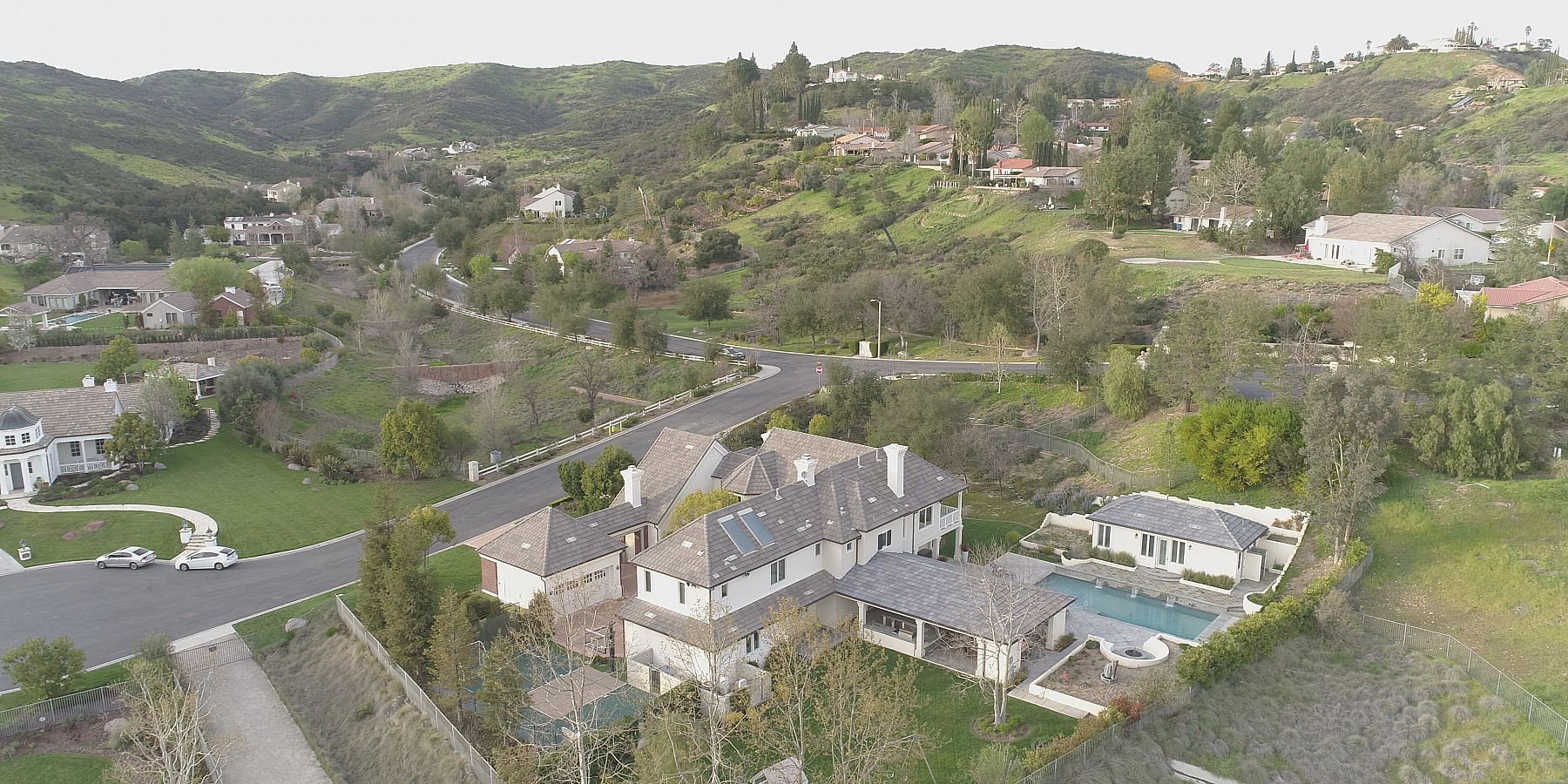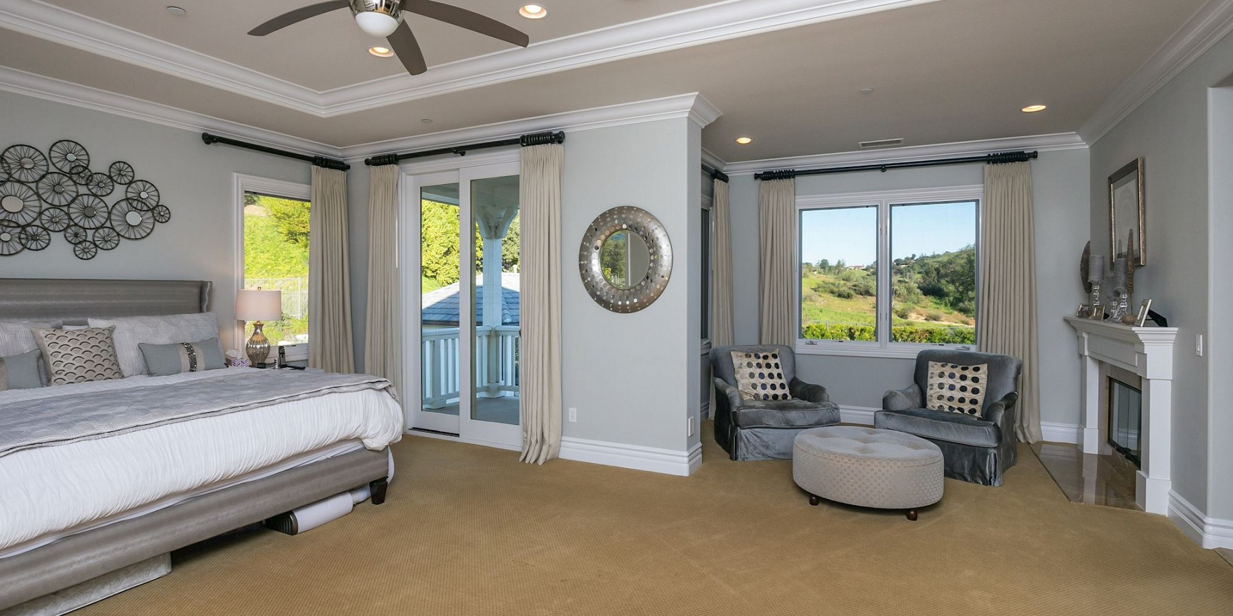 These words by the English novelist might well have been said about another countryside “touch of beauty” – right here in the heart of the Conejo Valley. After you’ve driven through the private-gated community, then reached the home itself, the red-brick portico and acre of regal landscaping, makes one fantasize about arriving in the rolling countryside of Oxfordshire! And if that suits your fancy, then it’s time to play a game of pool in the gorgeous billiard room, complete with darkwood floors, handsome fireplace, and coffered ceiling. The elegant kitchen is another area reminiscent of the graceful lifestyle of a British manor, with its chef stove and refrigerator, custom moldings, and butler’s pantry.