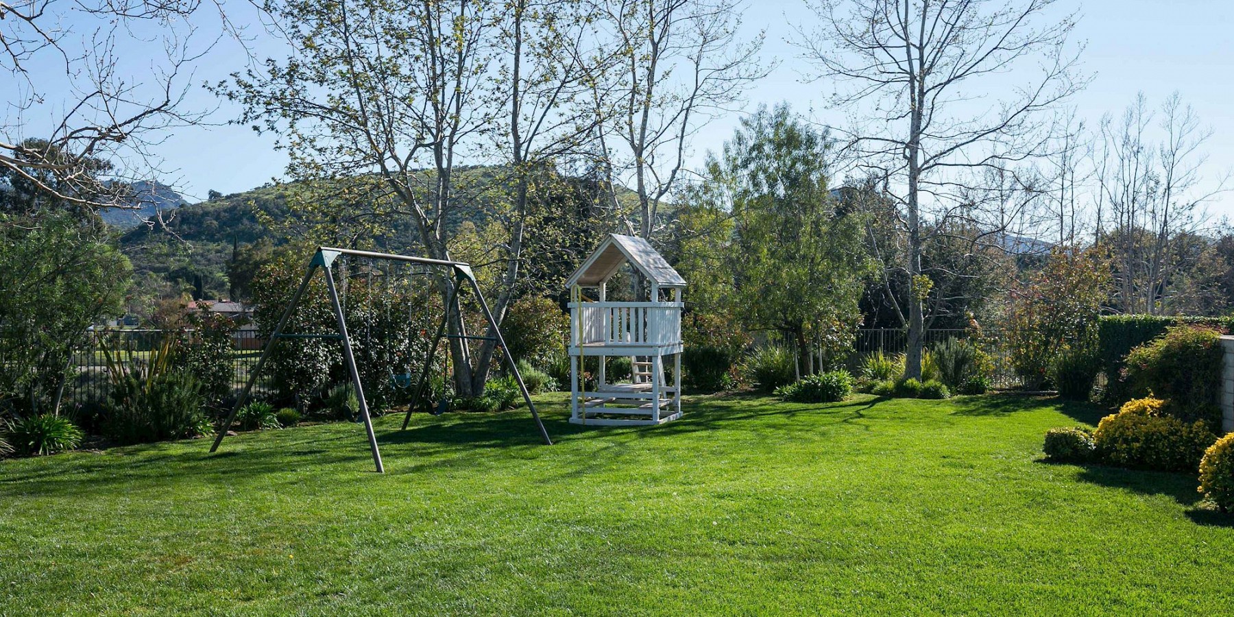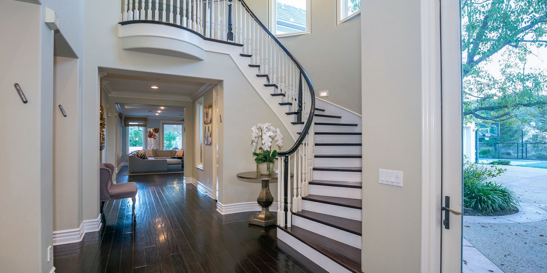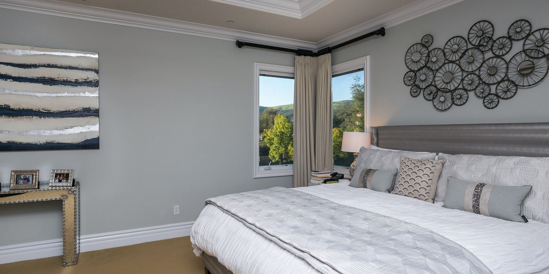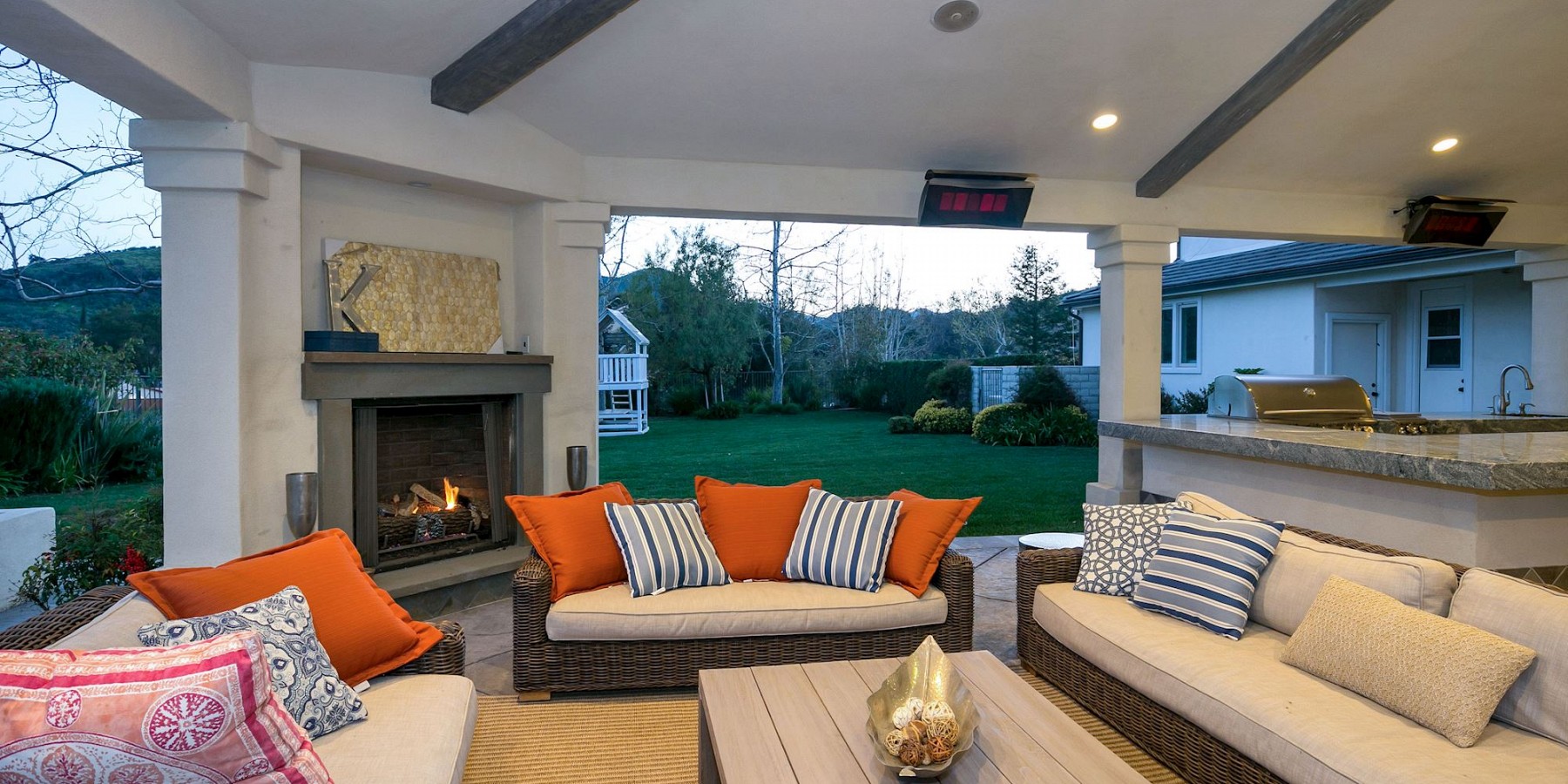 These words by the English novelist might well have been said about another countryside “touch of beauty” – right here in the heart of the Conejo Valley. After you’ve driven through the private-gated community, then reached the home itself, the red-brick portico and acre of regal landscaping, makes one fantasize about arriving in the rolling countryside of Oxfordshire! And if that suits your fancy, then it’s time to play a game of pool in the gorgeous billiard room, complete with darkwood floors, handsome fireplace, and coffered ceiling. The elegant kitchen is another area reminiscent of the graceful lifestyle of a British manor, with its chef stove and refrigerator, custom moldings, and butler’s pantry.