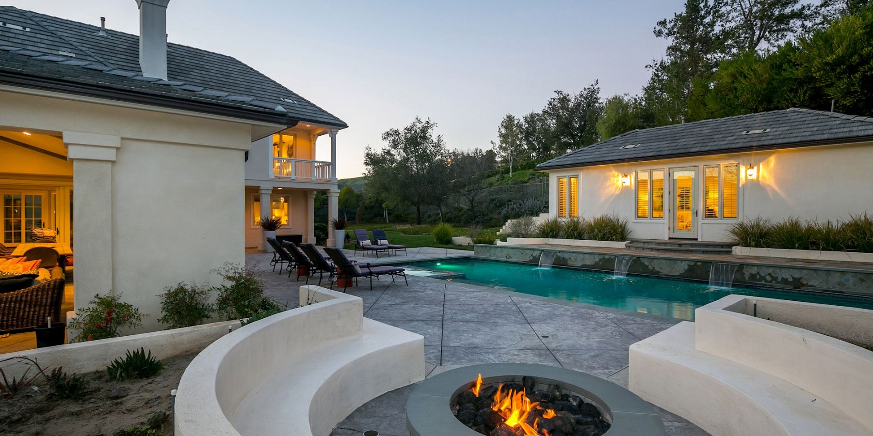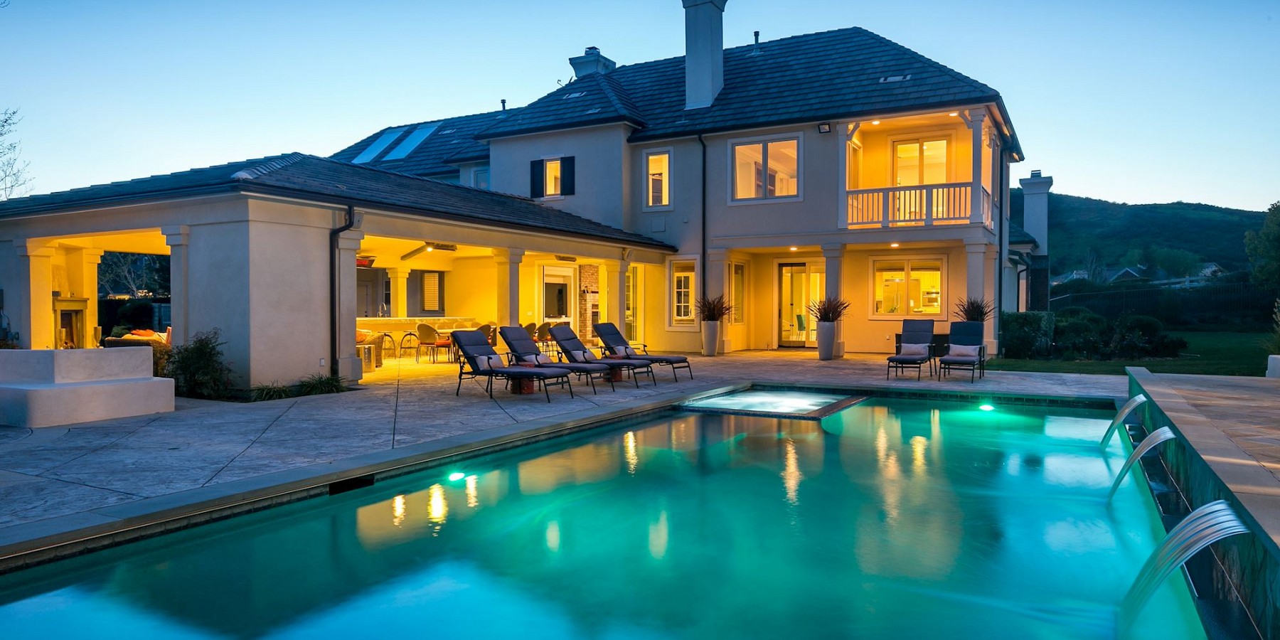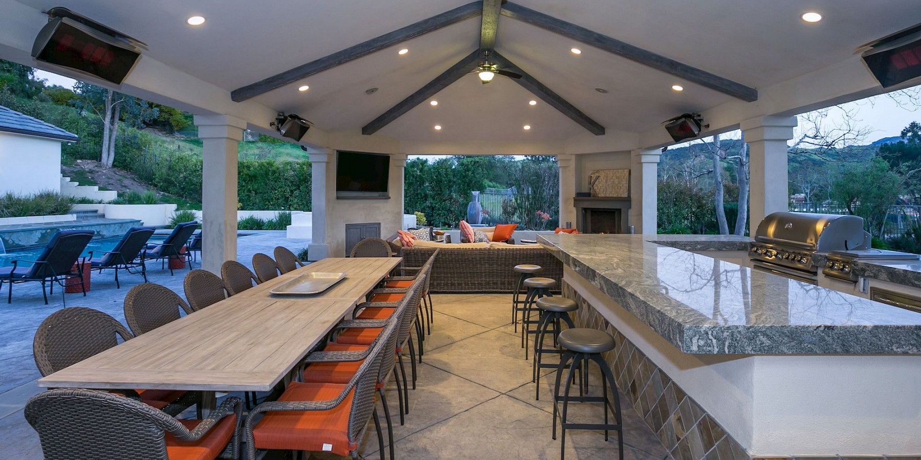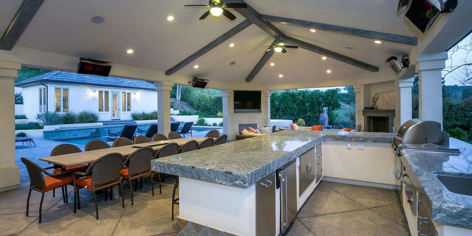 It is the exterior of this estate, however, where the architect let his ingenuity shine, with something for everyone! A custom sports-court will keep both kids and adults entertained for hours, and when they are ready to relax, a saltwater pool and spa beckons. The covered, outdoor living area, with cam lighting, is better equipped than most modern kitchens, with a massive dining area, several lounges, one with a fire pit, one with a fireplace, and all offering dazzling views of the surrounding mountains. Several green areas on the property are perfect for soccer or croquet, and the community also offers easy access to neighboring trails. The piece de resistance, however, might be the pool/guest house. Its large living room, elegant marble bath, bar area, and outdoor shower is the ideal space to tidy up after a swim, play a game of chess before dinner, or treat yourself to an afternoon siesta!