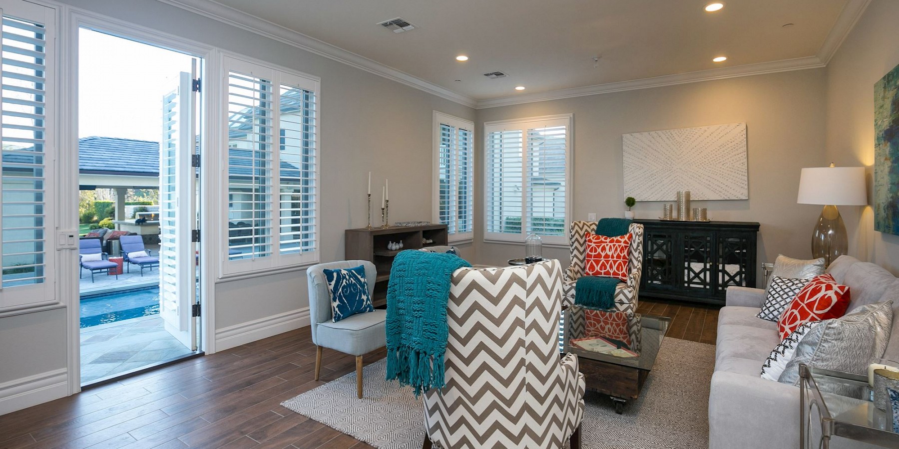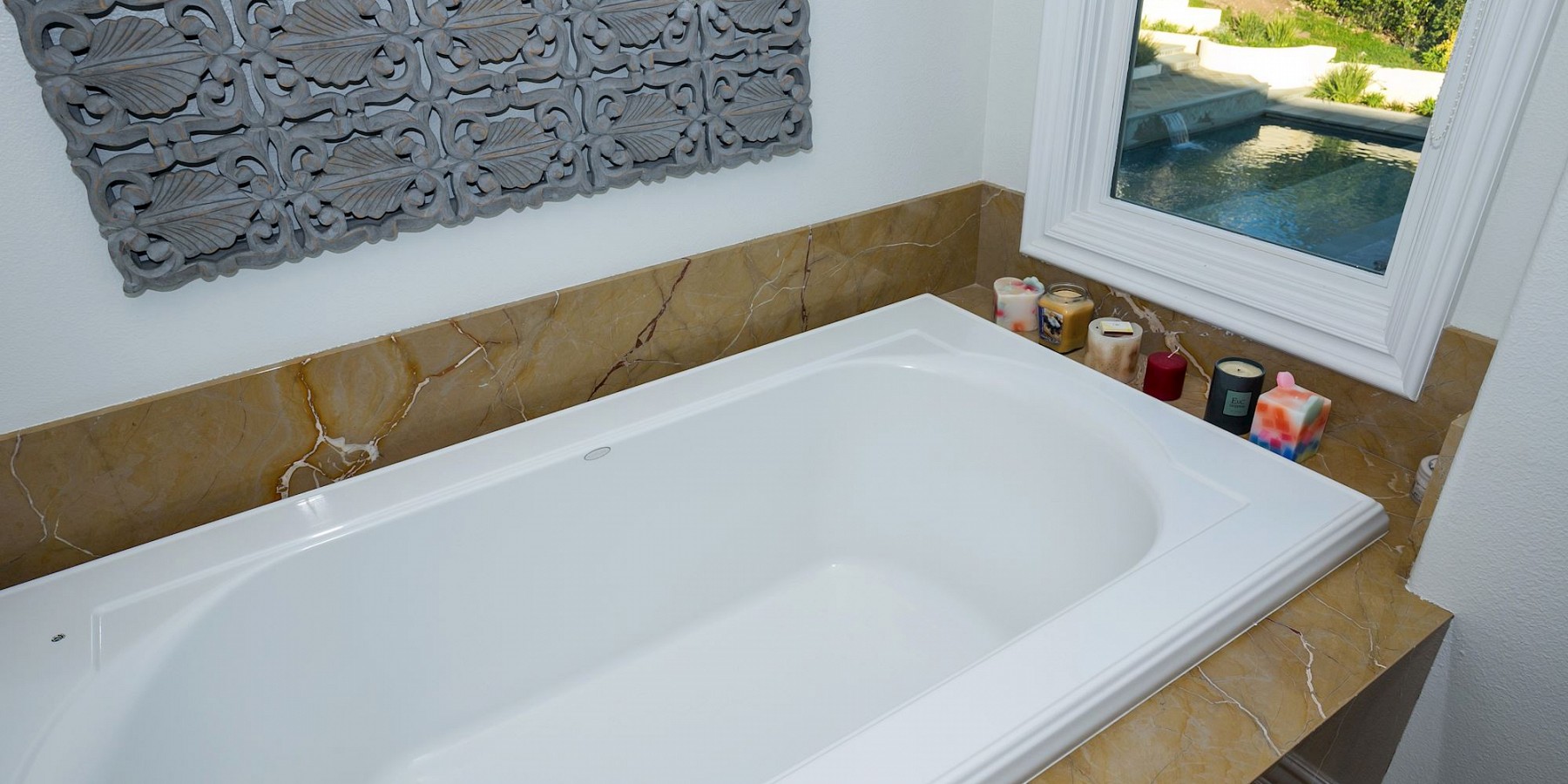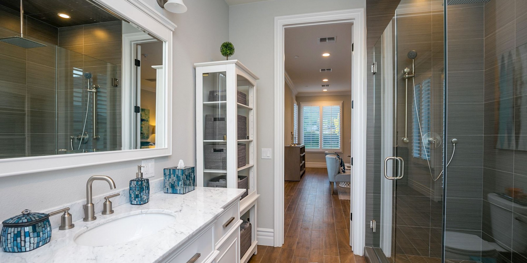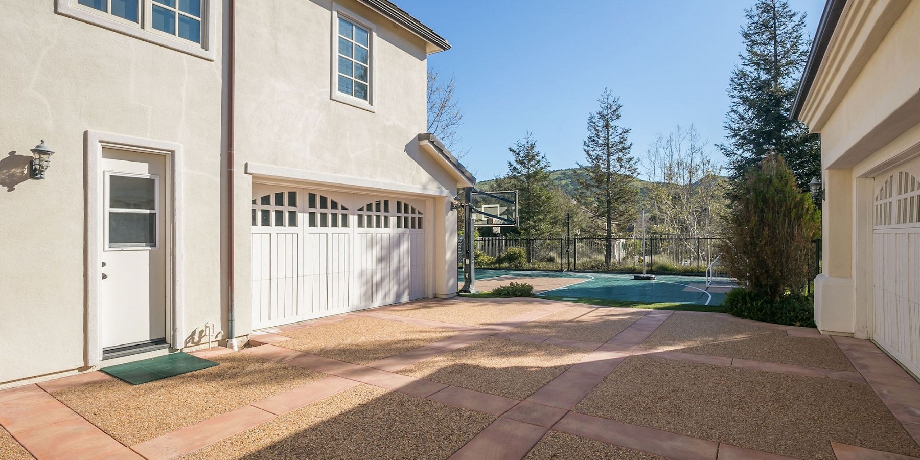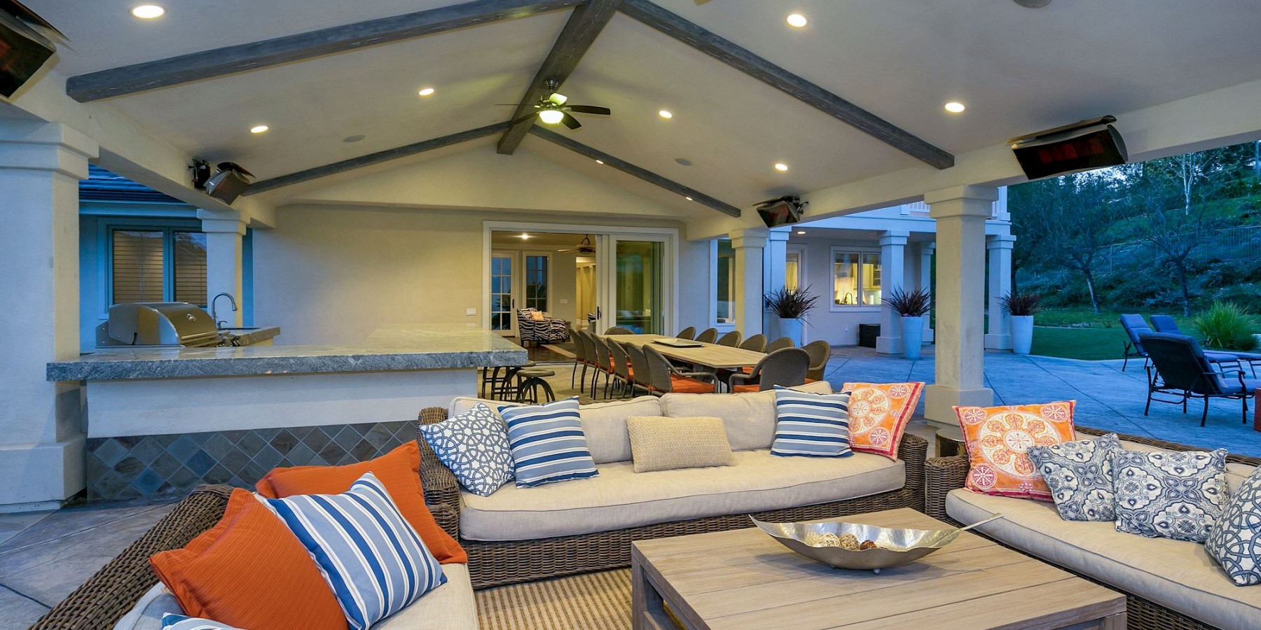 It is the exterior of this estate, however, where the architect let his ingenuity shine, with something for everyone! A custom sports-court will keep both kids and adults entertained for hours, and when they are ready to relax, a saltwater pool and spa beckons. The covered, outdoor living area, with cam lighting, is better equipped than most modern kitchens, with a massive dining area, several lounges, one with a fire pit, one with a fireplace, and all offering dazzling views of the surrounding mountains. Several green areas on the property are perfect for soccer or croquet, and the community also offers easy access to neighboring trails. The piece de resistance, however, might be the pool/guest house. Its large living room, elegant marble bath, bar area, and outdoor shower is the ideal space to tidy up after a swim, play a game of chess before dinner, or treat yourself to an afternoon siesta!