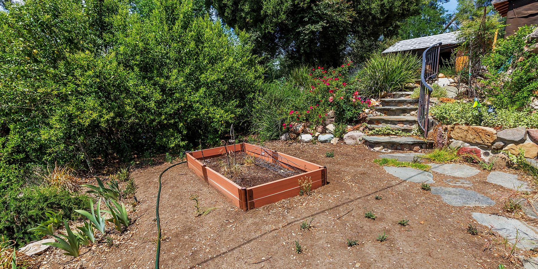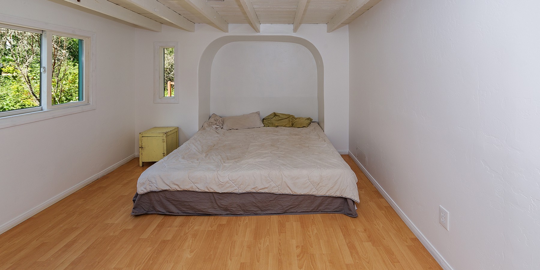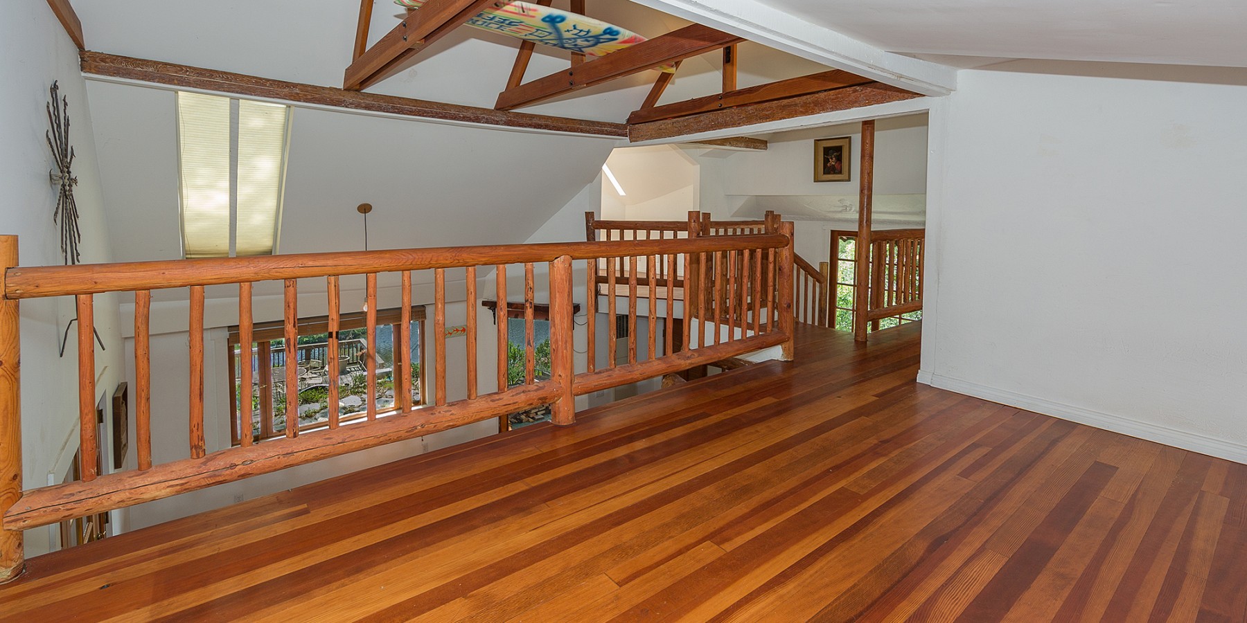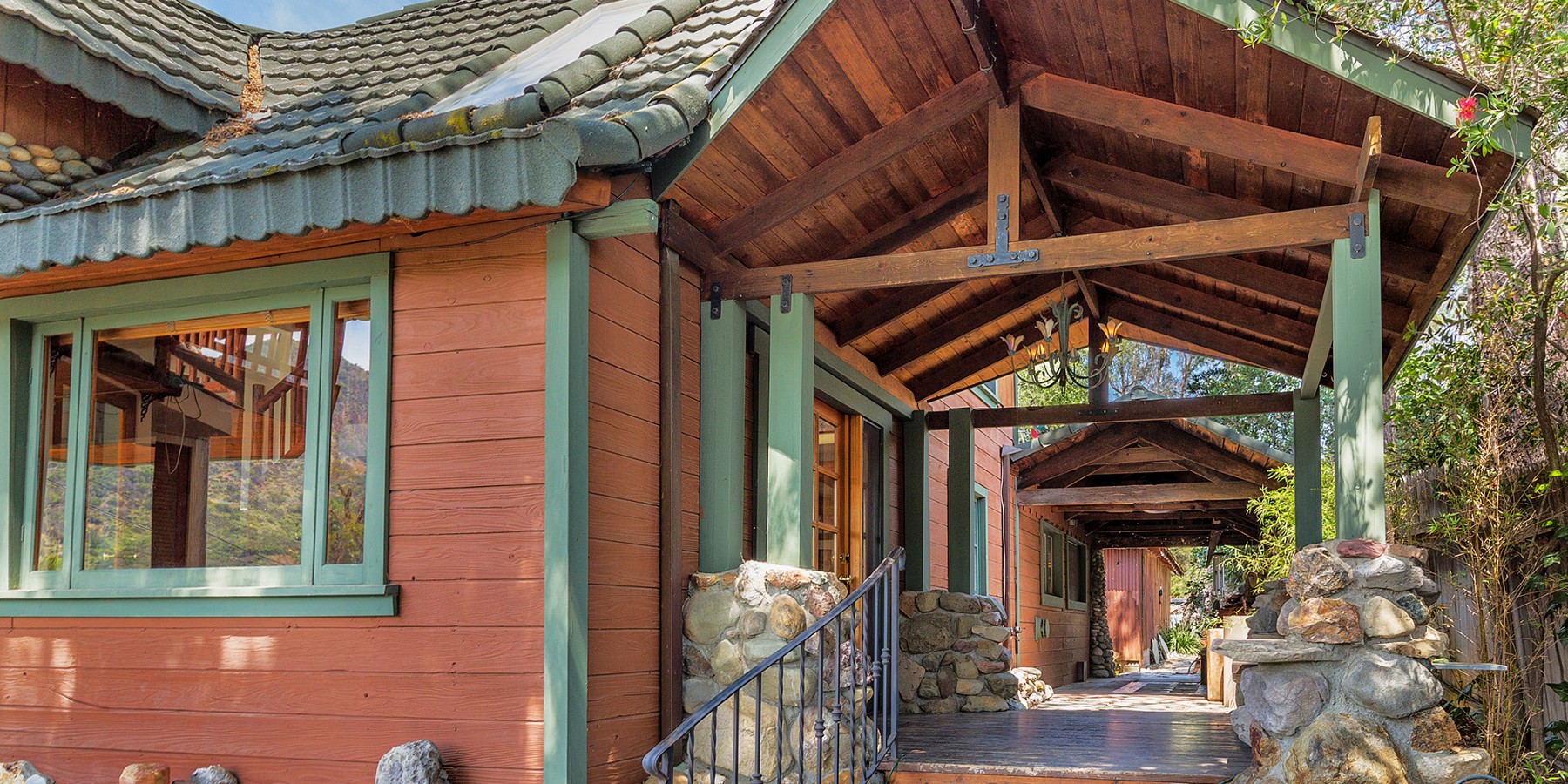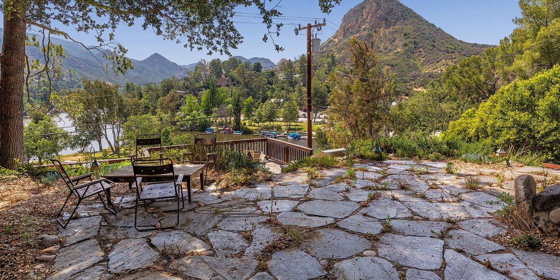 Walking up the slate pathway, through an arched-stone entry with green picket fence, makes people feel they are back in the early 1900’s, as they might well be, since this is one of the lake’s original homes, with its massive log beams, original Douglas fir flooring, and adobe fireplace, its wide, hearth inviting us to enjoy the cozy fire.