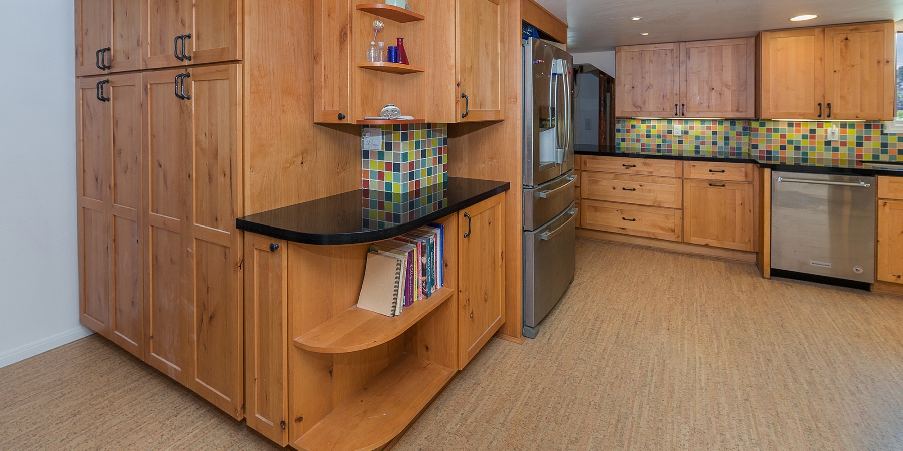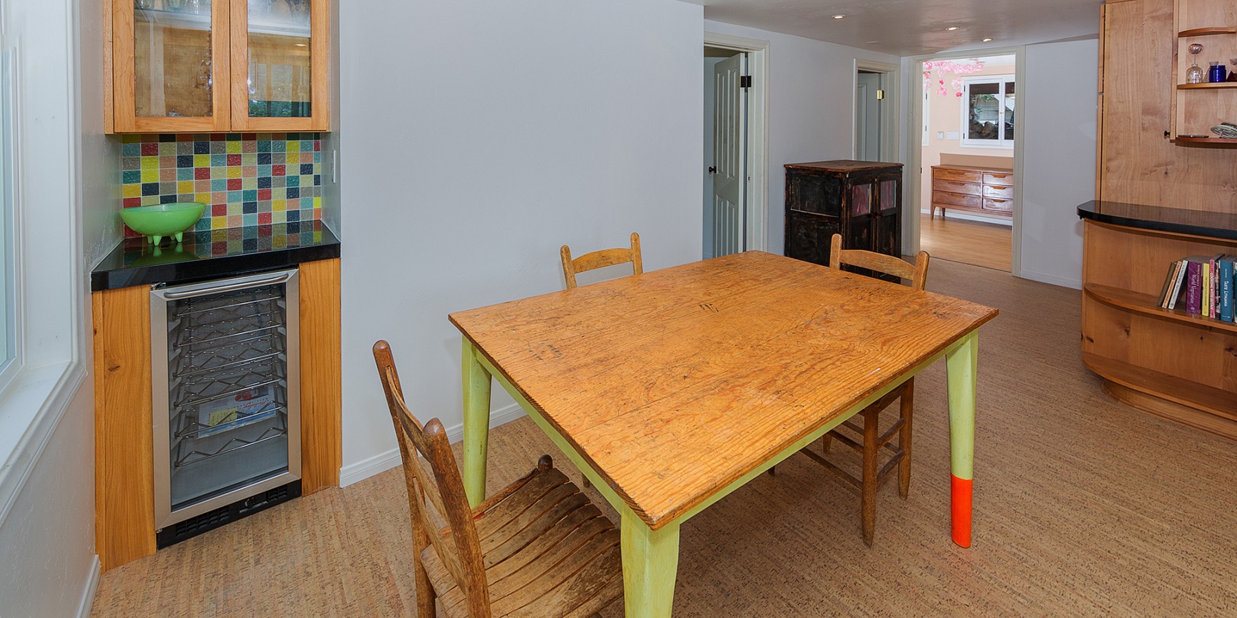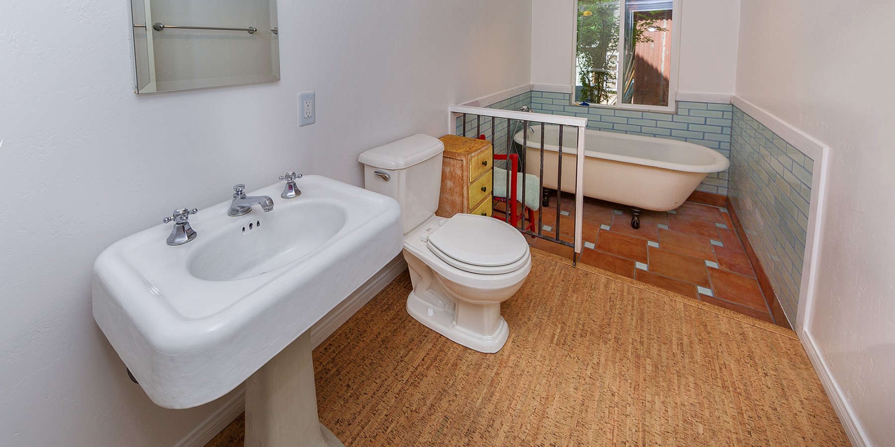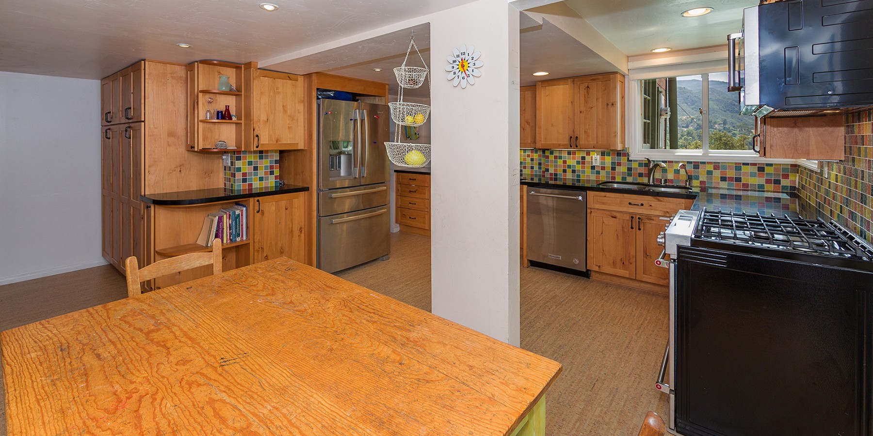 Yes, the large, open kitchen has plentiful knotty pine cupboards similar to those of the “early days,” but the old and the new fit beautifully, with Cork flooring and stainless steel appliances guaranteed to make any aspiring chef beam! The stainless, double-sink looks out to a stunning view of the Santa Monica mountains, which will have anyone willing to do the day’s dishes. A guest bath was recently remodeled on the first floor with a claw foot tub.