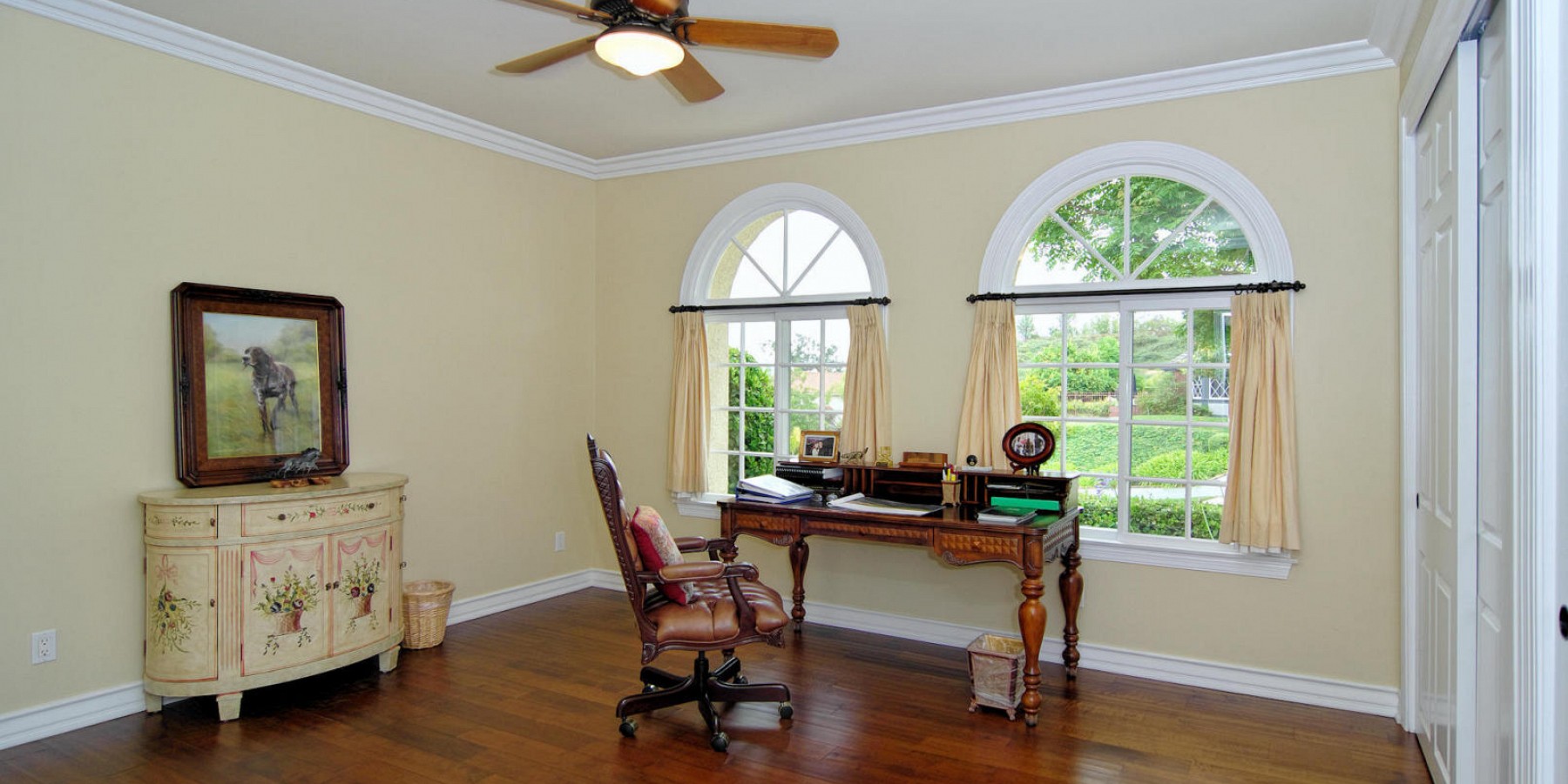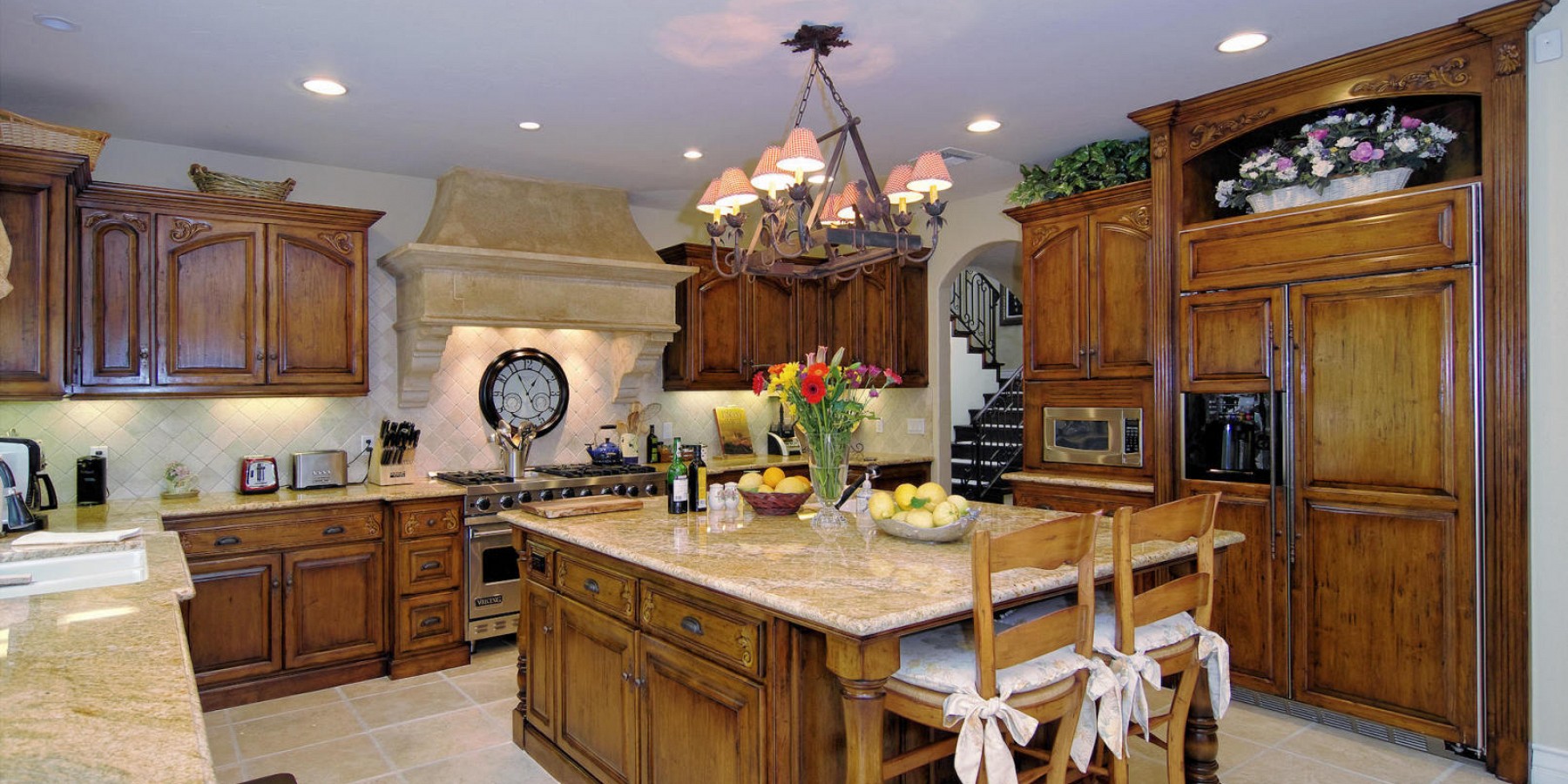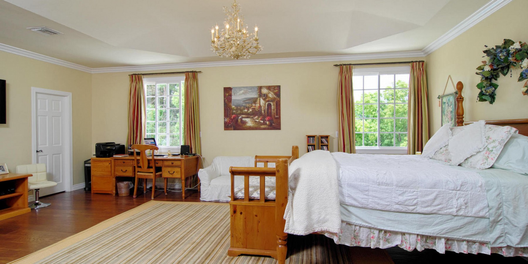 The family kitchen cries out bon appetit: a breakfast nook surrounded by windows, all facing the pool; a huge island, with a lovely French country chandelier; custom, wood-covered appliances, including a professional Viking, 6-burner stove; travertine flooring, custom cabinetry inported from France. Two guest bedrooms share an impeccably upgraded bathroom, and the third guest room has an ensuite bath. A powder room and laundry room are also on the first level.