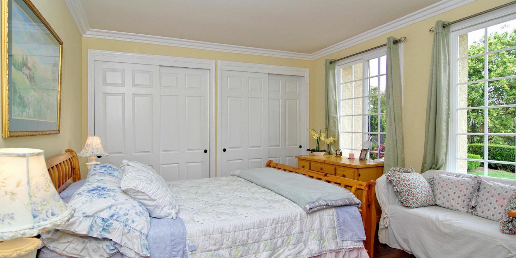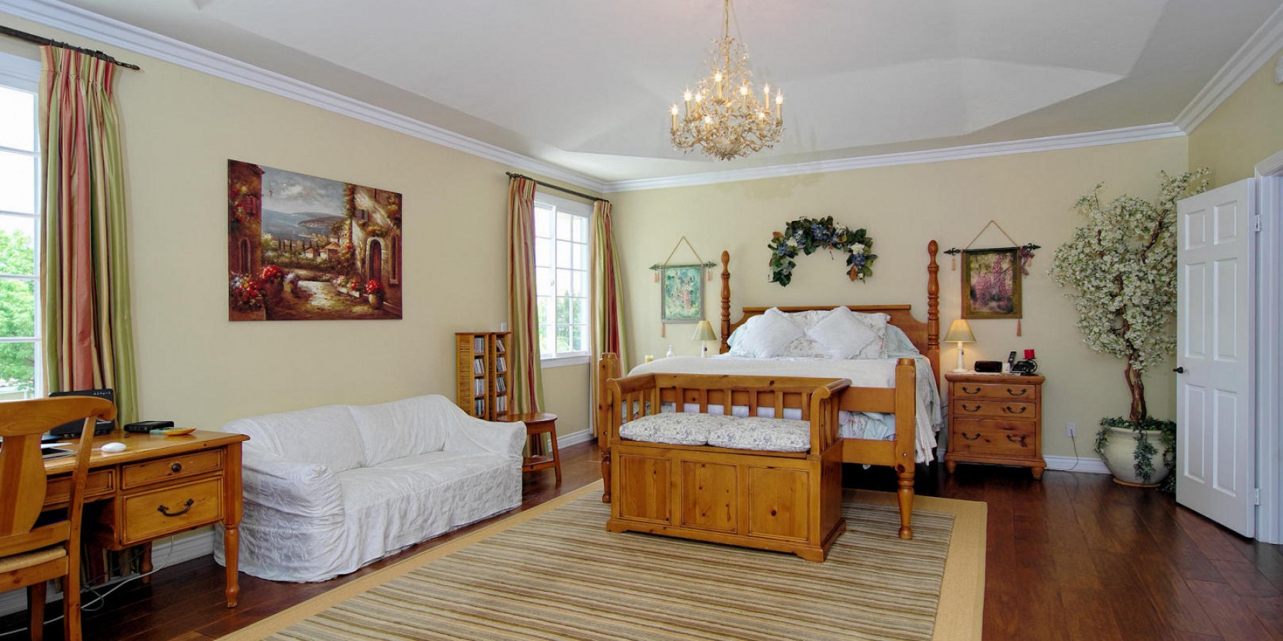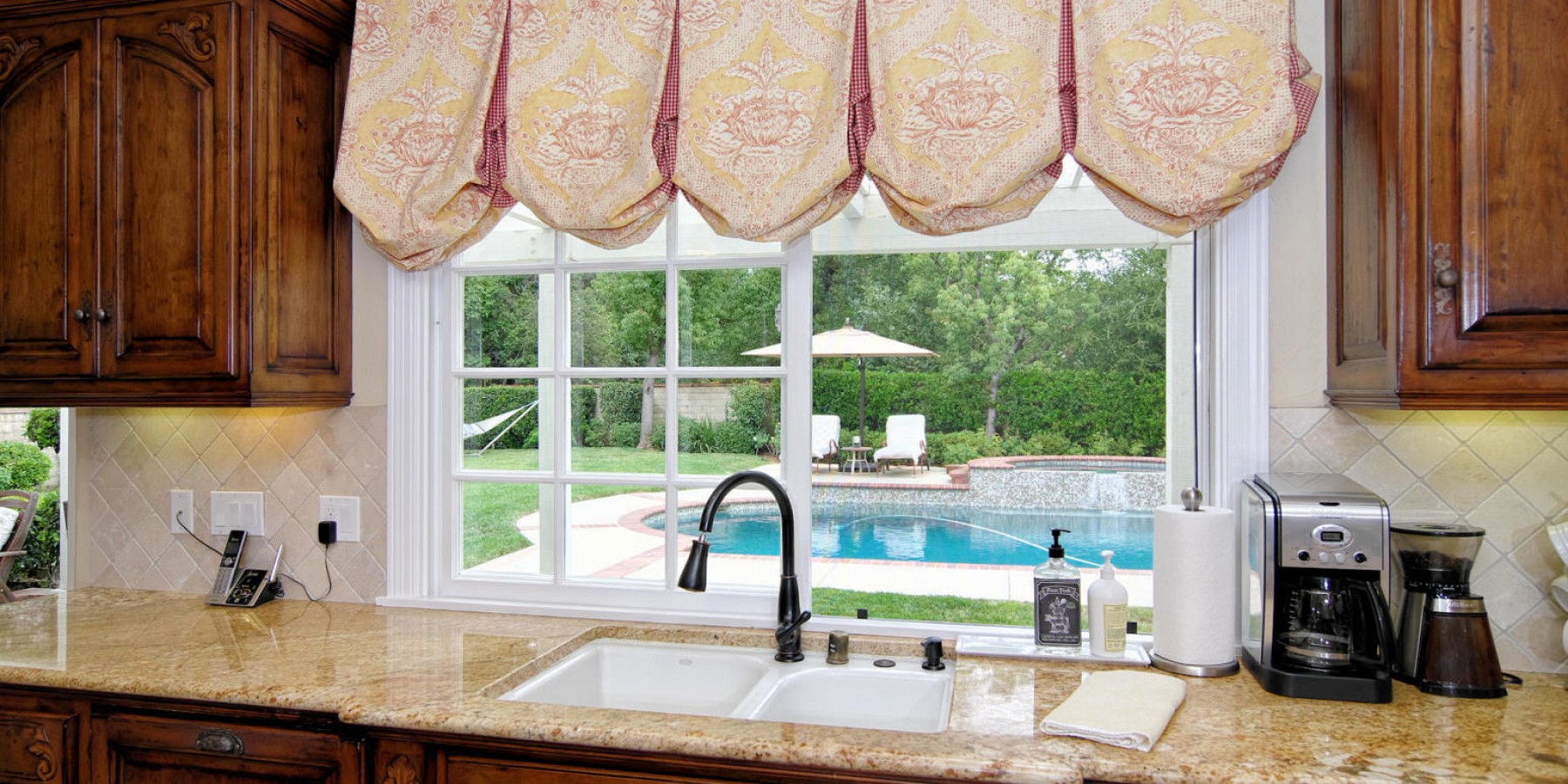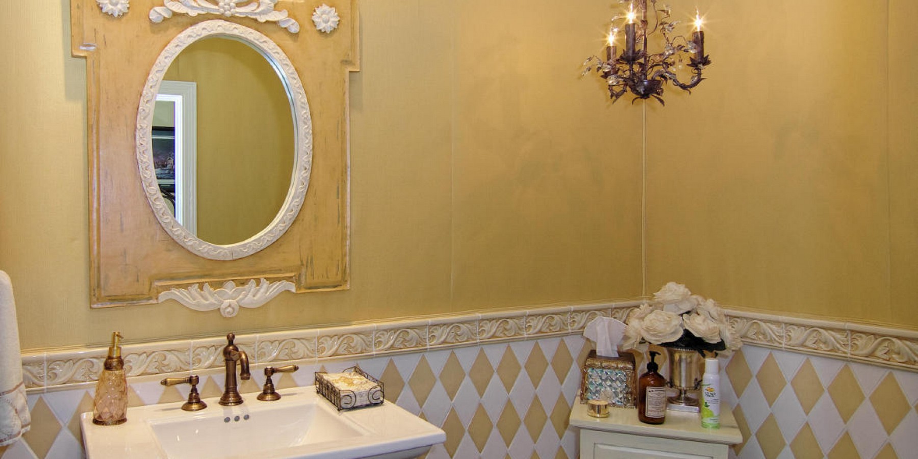 The family kitchen cries out bon appetit: a breakfast nook surrounded by windows, all facing the pool; a huge island, with a lovely French country chandelier; custom, wood-covered appliances, including a professional Viking, 6-burner stove; travertine flooring, custom cabinetry inported from France. Two guest bedrooms share an impeccably upgraded bathroom, and the third guest room has an ensuite bath. A powder room and laundry room are also on the first level.