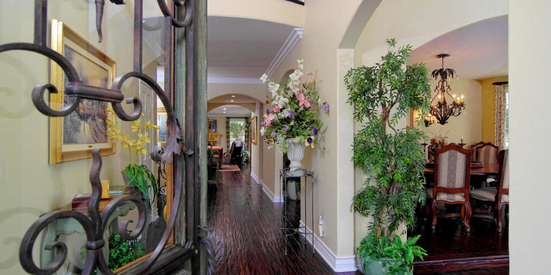 A popular French proverb states: “There is no key for happiness, the door is always open.” Which is exactly what you will find in this remarkable French chateau – the open door to total happiness! Just follow the brick steps leading to the hand-forged iron door, opening to a 9-foot high foyer of handsome, dark hardwood floors. The formal living room features a stone fireplace; next to it, the large dining room includes two beautiful arches and a charming bay window overlooking the patio. The family room, also with a stone fireplace, has a custom, built-in bar, and French doors leading to the pool area.