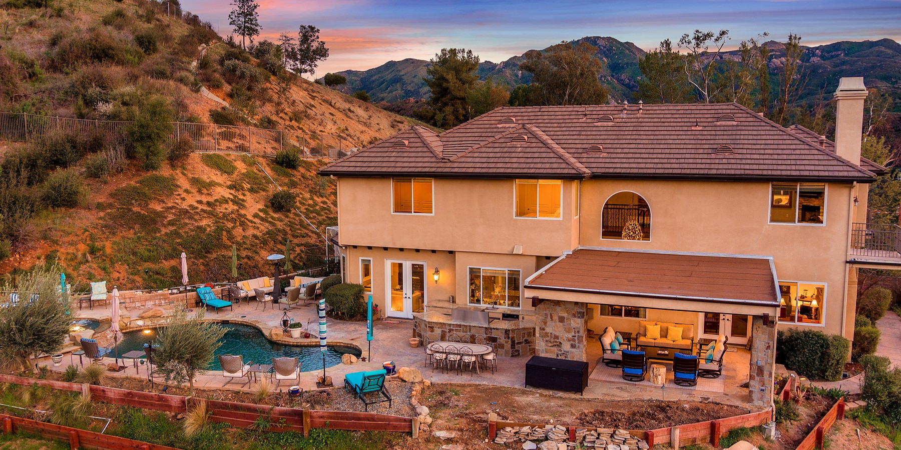 Privacy, views, luxury and lake all wrapped up in one phenomenal home. Perched on a hillside with panoramic lake and mountain views including Ladyface, Sugarloaf and South into the Santa Monica Mountain range. Custom built with extraordinary open plan. Recently completed custom temperature controlled Quartz wine bar w/built-in expresso machine that would make many restaurants jealous. Gourmet kitchen w/freestanding Viking oven/range, center island including sink, rich granite counters and beautiful cabinetry. Master retreat w/dual walk-in, marble bath and gorgeous views of lake and mountains. Two large secondary bedrooms up with a lower level en-suite bed and bath. A fantastic lower bonus office features great views. Wood, marble and slate flooring, high ceilings, with an added benefit of an installed full house generator. The outdoor experience is enhanced by a outdoor kitchen, pool, spa, firepit and covered patio area with installed overhead heaters for year round enjoyment. A small orchard of fruit trees with many varietal has been started but plenty of space to add on this nearly 1 acre lot. Members at Malibou Lake Mountain club enjoy year round water fun with boating, sailing, fishing and more. There is also a community pool clubhouse and tennis court for the member's enjoyment. Along with this home a private dock site is available for development by new owner. Easy access into state and national recreation areas and minutes to all conveniences. So close but yet so far!