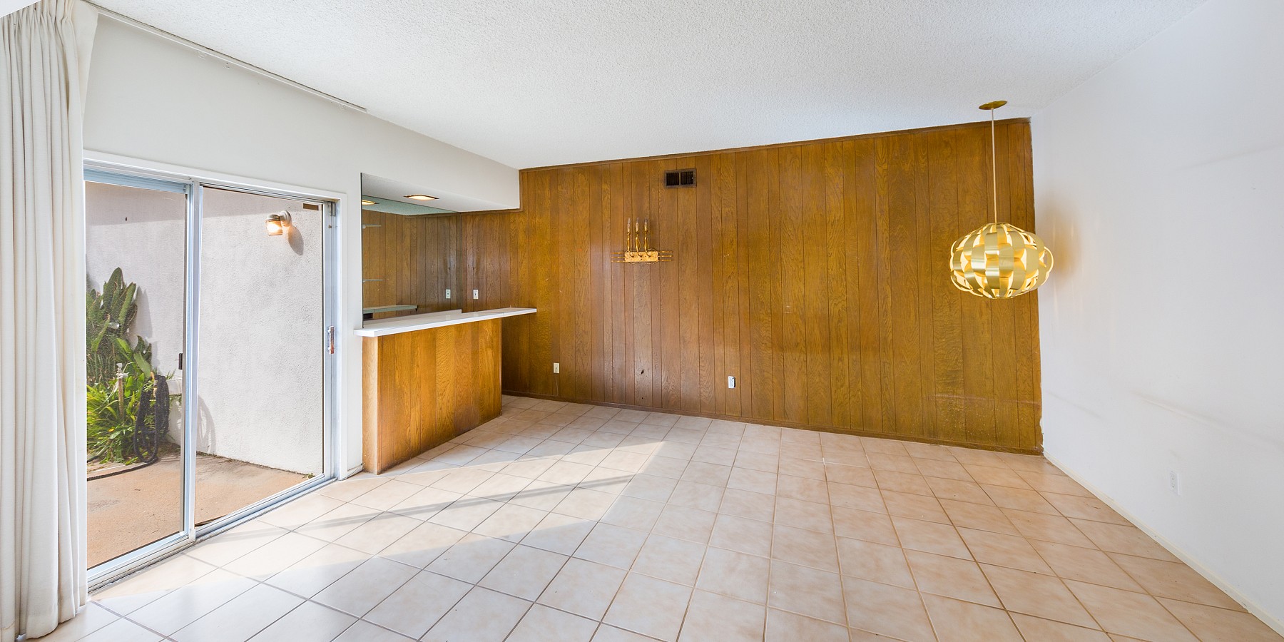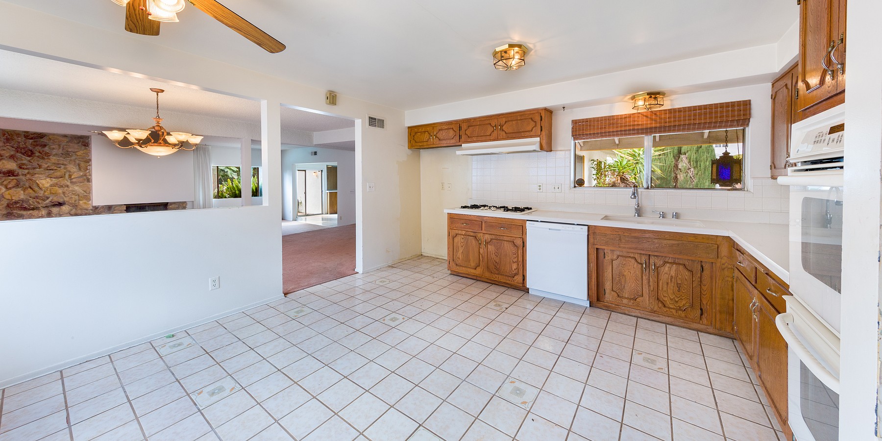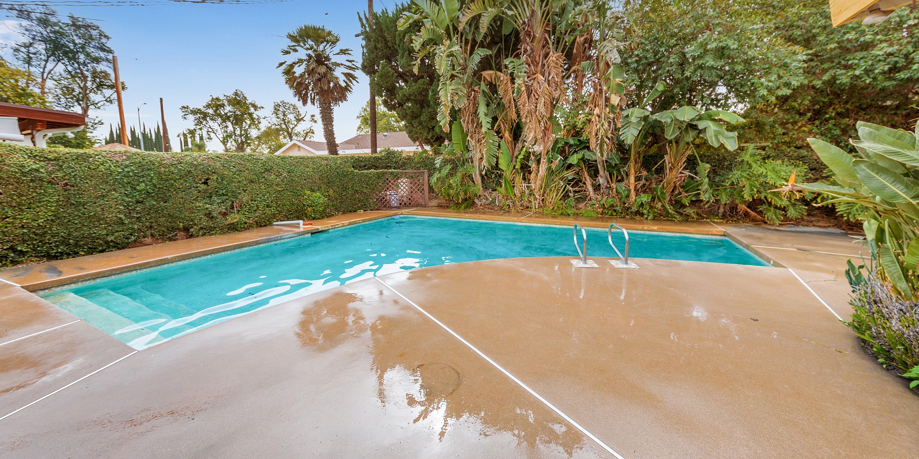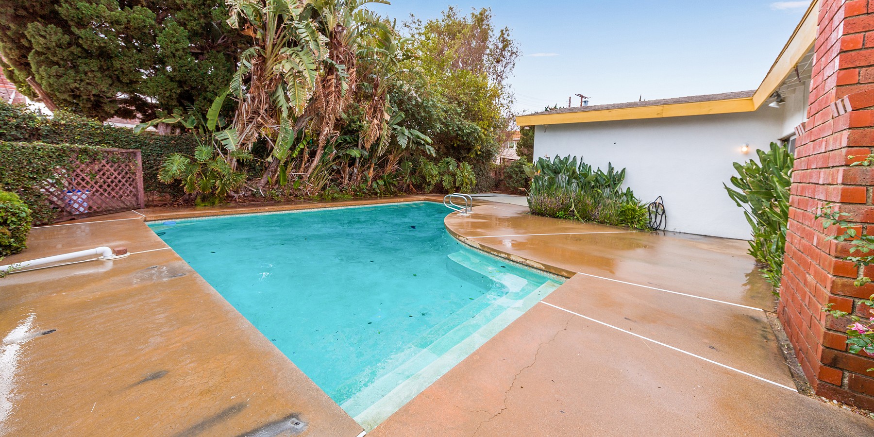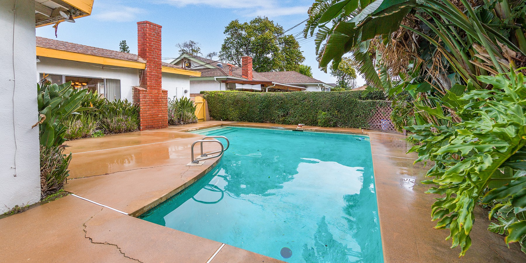 Rare opportunity for a 4 bedroom wide open single story floorplan. Kitchen, dining, living and secondary living are all open and provide the great room concept (way ahead of it's time for 1964). The home is in original (Vintage) condition and will require cosmetic updates throughout. The large living room has sliders to the rear yard and a stone centered fireplace. The primary suite features a recessed tub and shower plus a large walk-in, secondary bedrooms feature mirrored wardrobe doors. There is a shared bath and shared powder. Part of the garage was converted to an independent laundry room and two storage closets. Fantastic front yard with lawn area and curved driveway would lend itself to an ideal curb appeal home. Rear yard has loads of patio space and a beautiful pool with incredible Birds of Paradise sheltering the South wall. This is an ideal starter home or a contractor's dream.