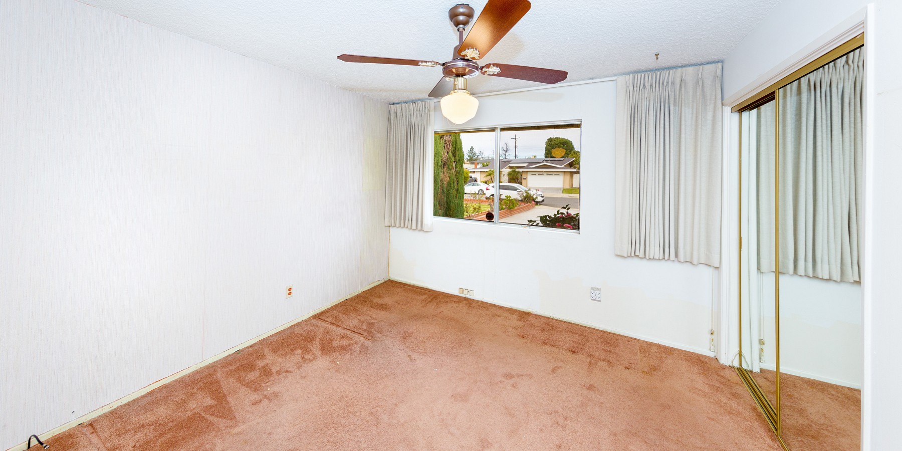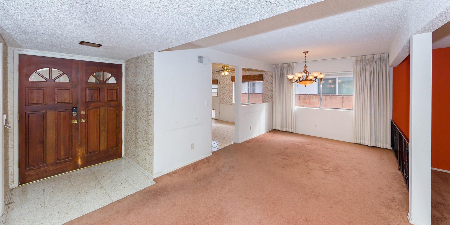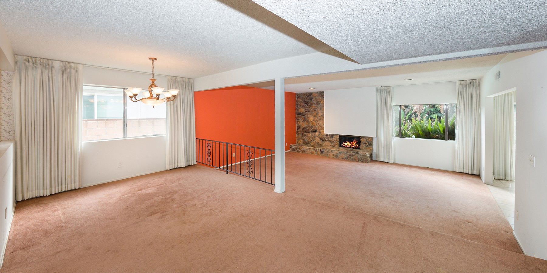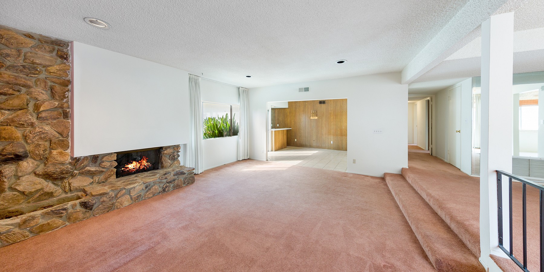 Rare opportunity for a 4 bedroom wide open single story floorplan. Kitchen, dining, living and secondary living are all open and provide the great room concept (way ahead of it's time for 1964). The home is in original (Vintage) condition and will require cosmetic updates throughout. The large living room has sliders to the rear yard and a stone centered fireplace. The primary suite features a recessed tub and shower plus a large walk-in, secondary bedrooms feature mirrored wardrobe doors. There is a shared bath and shared powder. Part of the garage was converted to an independent laundry room and two storage closets. Fantastic front yard with lawn area and curved driveway would lend itself to an ideal curb appeal home. Rear yard has loads of patio space and a beautiful pool with incredible Birds of Paradise sheltering the South wall. This is an ideal starter home or a contractor's dream.