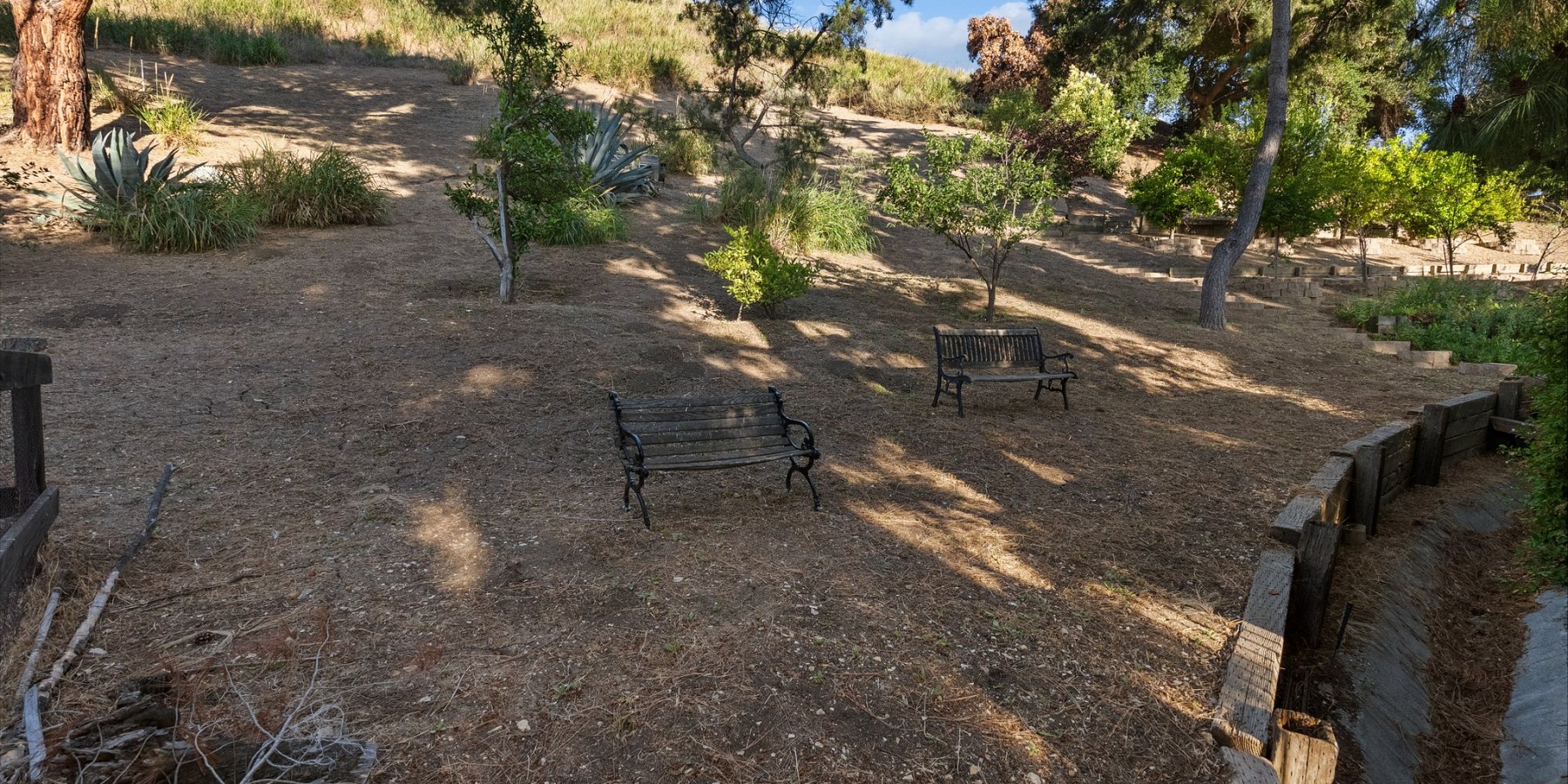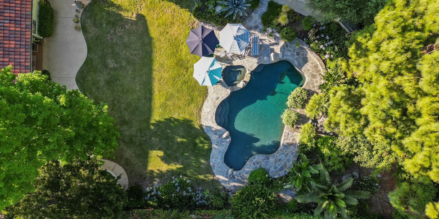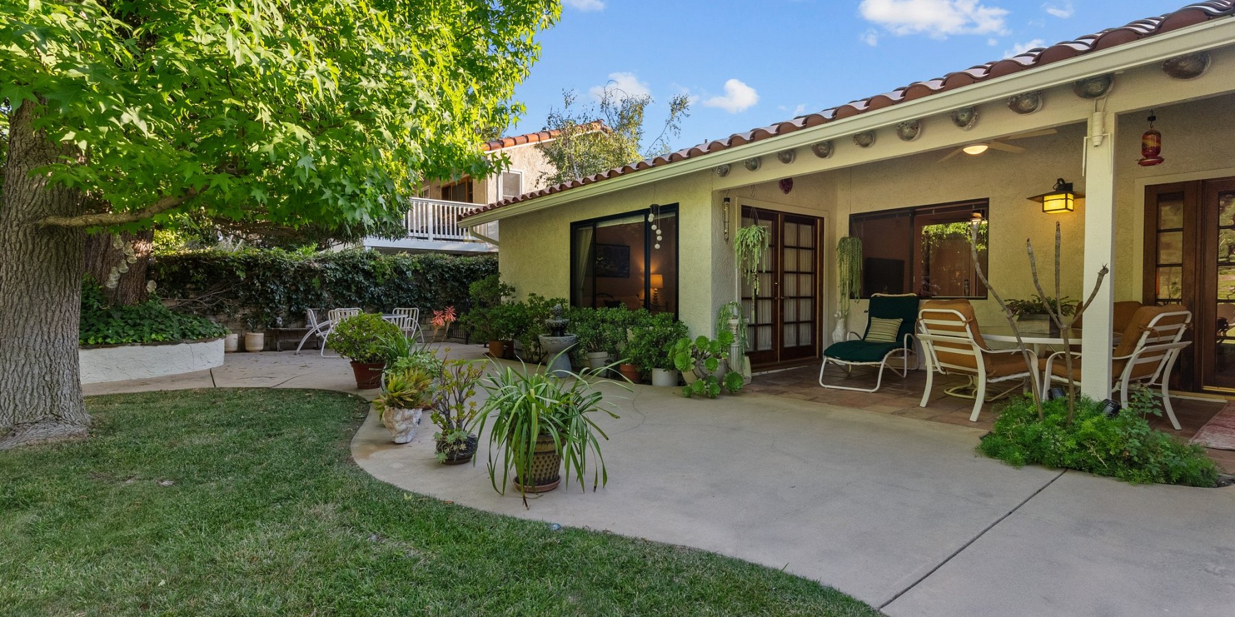 Oasis like backyard with incredible private setting. Huge lawn, pool, spa, lush landscaping beautifully maintained, mature trees, fruit trees, olive trees and large garden area. Single story with pitched beamed ceiling in living room and pitched in primary. French doors lead out to the gorgeous yard from living room and primary. Stunning succulent landscaped front entryway. Most of home is in original condition but very well maintained. One bath has been remodeled. Kitchen and living room windows view out to Saltillo tile covered patio. Large primary suite with walk-in and extra closet. Secondary bedrooms have lovely view windows and share the remodeled bath. Brick fireplace living room with shared dining area. Nestled at the top of Fountainwood with easy access to elementary and high school. Large roomy lots like this are very hard to find and make for the ideal outdoor California lifestyle.