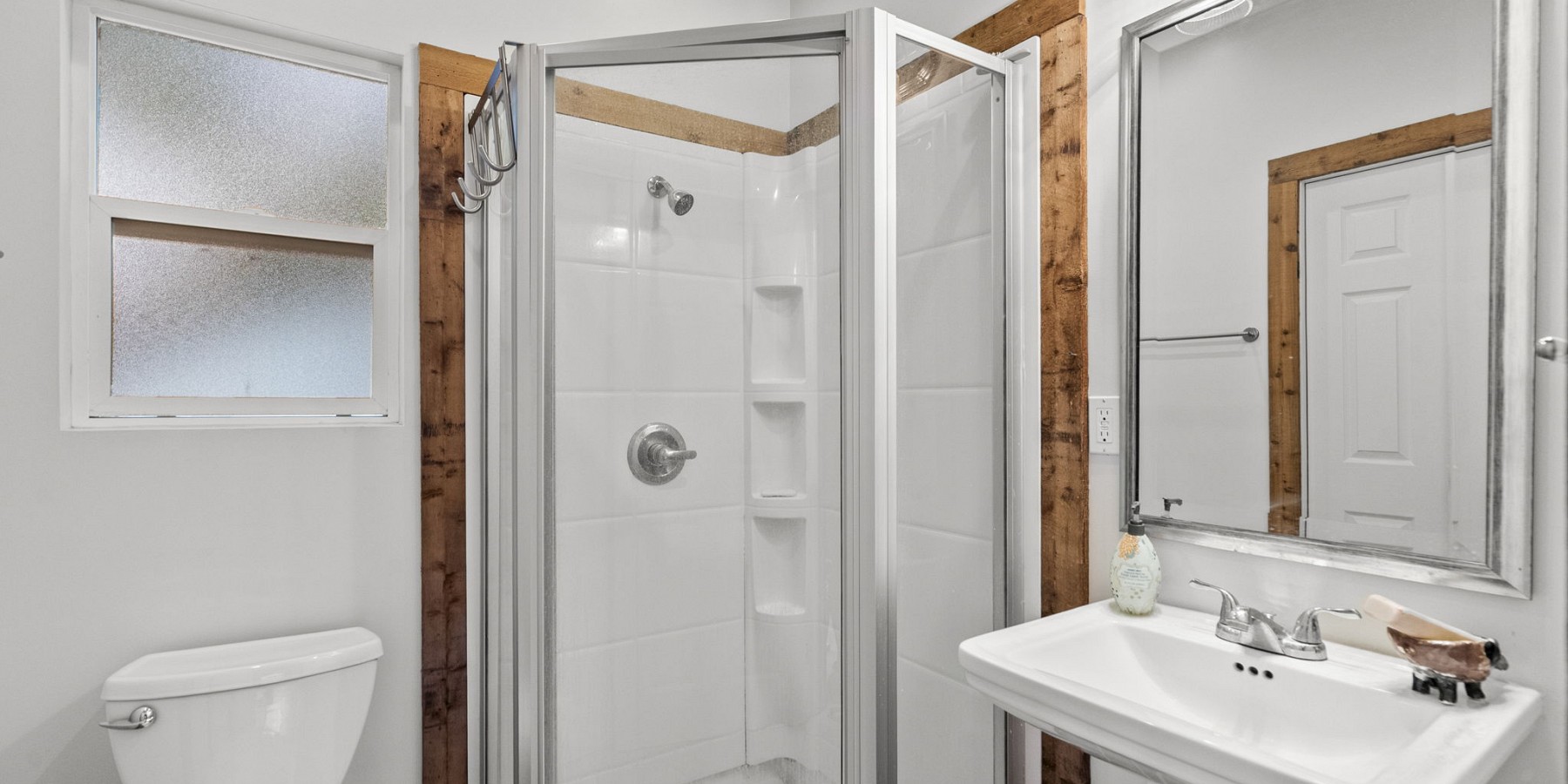 Inside, the main home boasts warm Hickory and Oak flooring, a masonry wood-burning fireplace for cozy evenings, and a character-rich kitchen with tile and Cherry wood butcher block counters. The lakefront primary suite features Jacuzzi brand spa tub and French doors that open onto large Iron wood deck. The living area opens to the same deck. The guest suite is equally inviting with wide plank French Oak floors, private bath and 9'-foot plus knotty pine ceilings. A functional basement w/ 8'-foot ceilings add bonus space not included in the official square footage.
