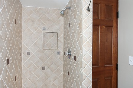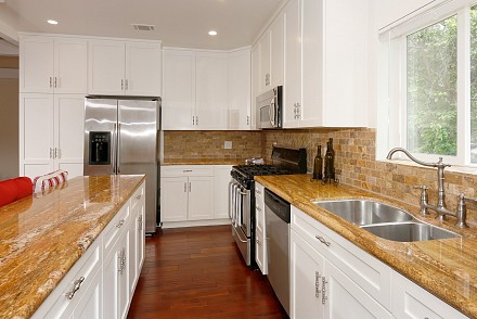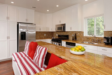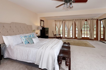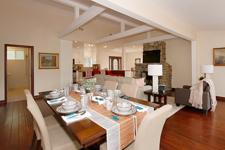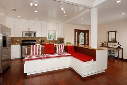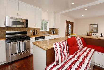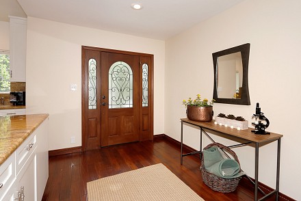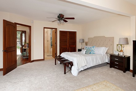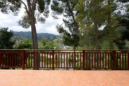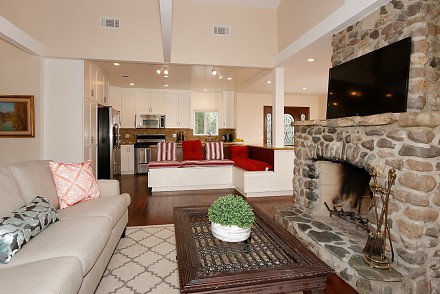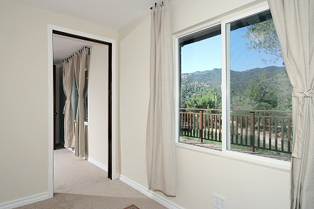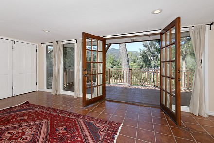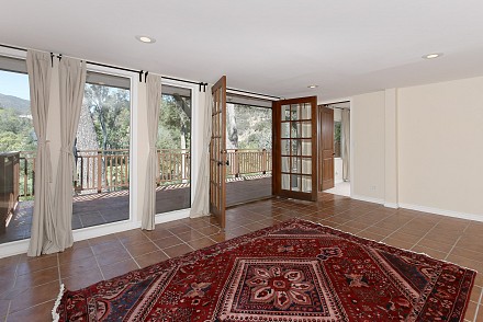 The view is breathtaking:the Santa Monica Mountains, the rolling lawn of the Malibou Lake Country Club,the lake below……..vast floor-to-ceiling windows and three French doors makes this setting visible from almost every room in the home. On the front side of the property,a flagstone path leads to a massive oak door. Inside,the original stone fireplace dominates as the centerpiece of the great room. There is also a large dining area and open kitchen,with granite countertops,a huge island,custom cabinetry,and stainless steel appliances. The atmosphere suggests “charming Malibou Lake,” but the pristine restorations are all new and perfect. All of the interior doors are custom oak,with an intricate woven braid carved around the doorways and along the floorboards,which is both unique and striking.