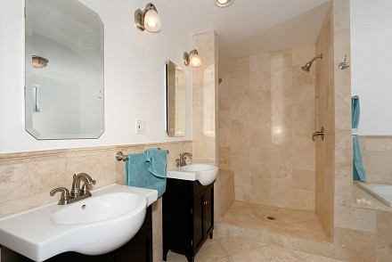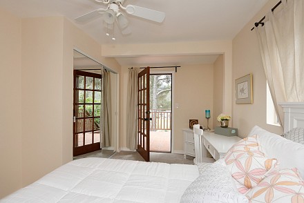 The master bedroom has two closets,a sitting area,and large ensuite bath,with a jetted tub, double shower, and two sinks. On the other side of the home are two guest rooms and a full bath,also beautifully renovated.