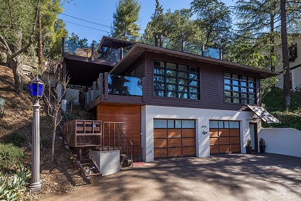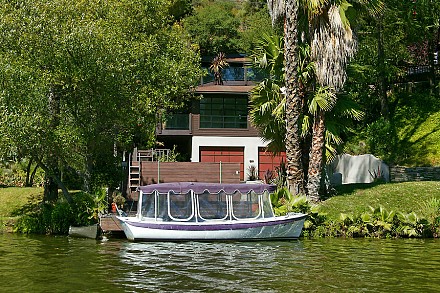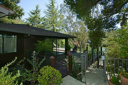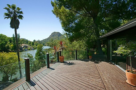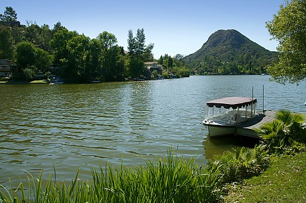 Malibou Lake has a lifestyle of its own.Hard to believe it's only 40 miles from LA w/this lakefront contemporary classic tucked in a forest of trees w/sunset,water and mountain views.Unique floor plan with 3 levels,each designed to display the matchless scenery Malibou Lake provides.Level 1 has an expansive private dock and 2 car garage,level 2 has wood and cork flooring,2 bedrooms,full bath and great room with floor to ceiling windows screening the lake and opening to view deck.Take the staircase or the outside venicular (electric lift) to the third level,and discover another huge great room w/rich wood floors opening to a mammoth wrap around deck,fantastic open beam ceiling kitchen w/stainless steel counters and appliances,large bedroom w/wood walls and ceilings,bath and private entry and master retreat w/walk-in closets and upgraded bathroom.Wrap around deck faces the lake and twists to private patio.Substantial storage space w/wine cellar, garden shed and backyard trails.