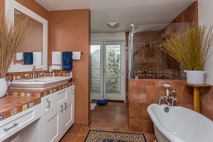 The master bedroom also has French doors leading to the courtyard,and the ensuite bath is a work of art,with its claw foot tub,custom shower,vanity,and intricate crown molding. Three guest bedrooms share a large bath,which also opens to the lap pool and spa. Each guest room is striking,with one walled in oak,perfect for a library,another with book shelves lining the tops of three walls. The formal dining room is reached by an exquisite iron gate,which is a hint of what follows: oak ceiling,and French doors leading to the courtyard. The living room features vaulted,open-beamed ceilings,another fireplace,and a stunning arched window facing a wall of bougainvillea. To truly understand the attention to detail in this superb home,walk into the garage,with its three walls of custom cabinetry and oriental rugs lining the immaculate floor! Finally,imagine getting the keys to this treasure and being able to say: “Mi casa, mi tesoro”!