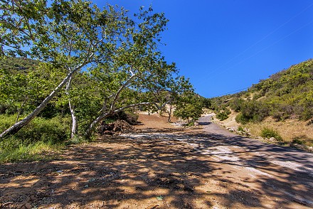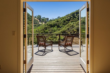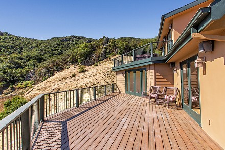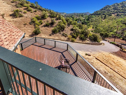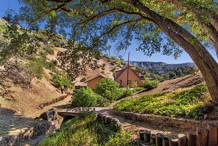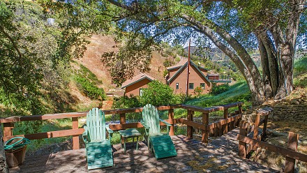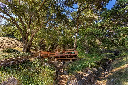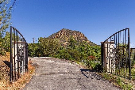 Then follow, not a “yellow brick road,” but the winding drive through massive sycamores and oaks, natural rock formations, and iron gates leading to a crossing overlooking a dry-creek bed and deck, until you reach……three acres of serene beauty.