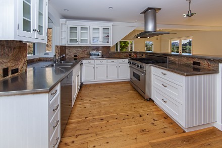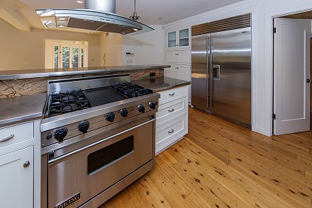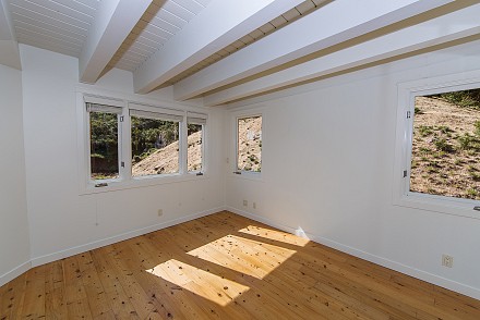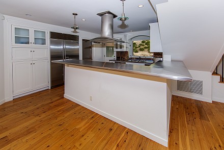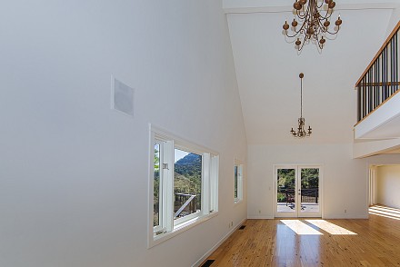 Inside, the focus immediately hones in on the gorgeous kitchen: knotty pine floors, pristine, white cabinetry, steel countertops, granite backsplash, and stainless appliances. This all adjoins the living room, with soaring ceilings and endless windows overlooking the hills. A large Trex deck encircles the living area on this level. Two lower bedrooms share wonderful views and a gorgeous stone bathroom.