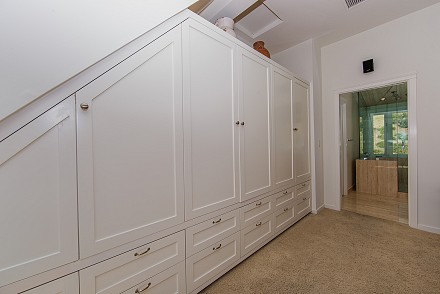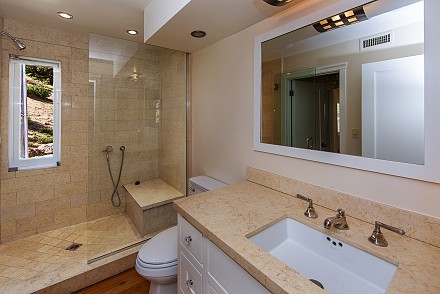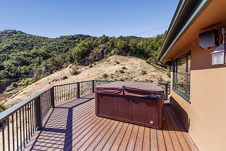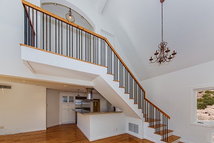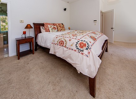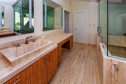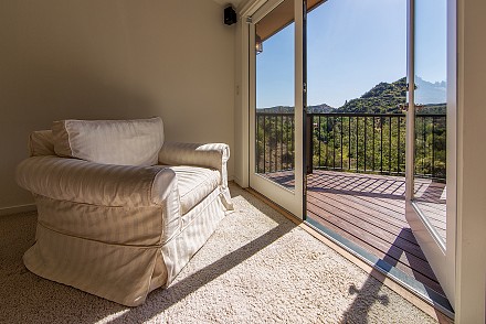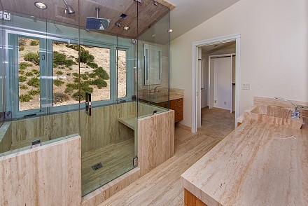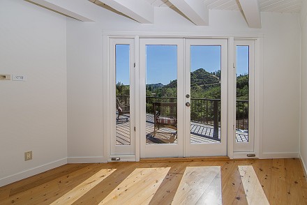 An elegant staircase winds to the second floor, which features a stunning master retreat. Meticulous attention has been given to the master suite, from the cathedral ceilings to the adjacent deck, with hot tub. Here, the views are even more sprawling, mountains and unusual rock formations surrounding the property. One wall of the bedroom is devoted to custom, built-in cabinetry, with enough room for the most expansive of wardrobes. Equally striking is the bathroom, with its oversized shower, double vanities, and gleaming granite.