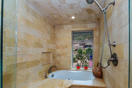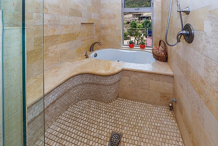 The most enticing space may be the master retreat, which highlights a spa tub and steam shower completely encased in travertine. This spacious bedroom, with French doors, leads to such an inviting private terrace, you may never want to leave.