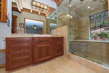 The two guest rooms also lead to adjacent verandas, revealing again how this home personifies California indoor/outdoor living! The garage, with its converted guest unit, provides room for any friends eager for a relaxing visit. Outside are several decks and terraces for both dining and enjoying the magnificent views, one with a fountain, another an above-ground spa.