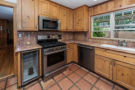 Just ambling up the brick walkway, with its abundance of greenery, lets visitors know they are in for a delightful surprise. The living room, with oak flooring and wood-burning fireplace, opens to a charming patio, as does the family room, with Saltillo tile floors and French doors facing the hills. The perfectly remodeled kitchen, also tiled, boasts stainless appliances, including a wine cooler. A granite breakfast bar and warm pine cabinetry create an inviting atmosphere for true country living in this three-bedroom, single-story ranch home.