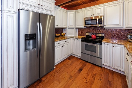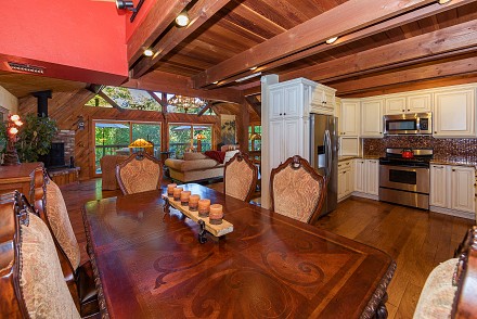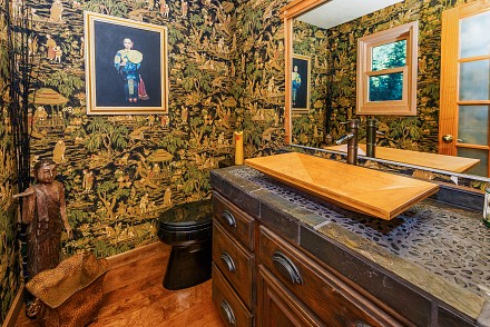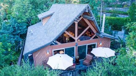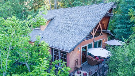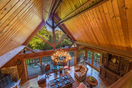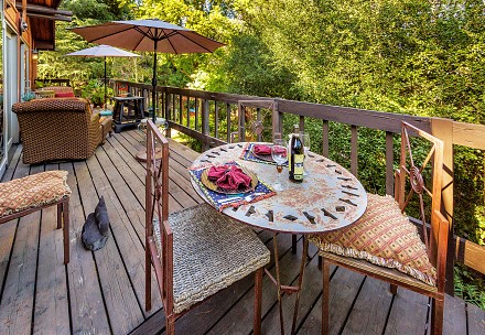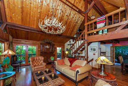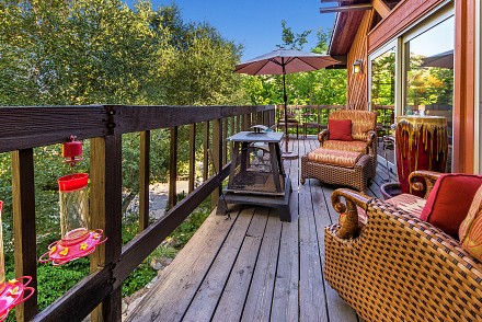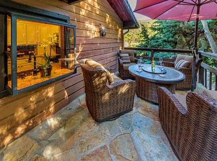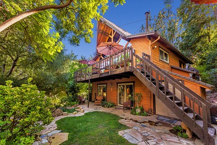 Envision a living and dining area, opening to the deck, with two sets of French doors, wooden floors, soaring vaulted ceiling, and stairs leading to a loft. A raised stone fireplace is in one corner, with a wall of windows and sliding doors opening to the hills. The adjoining kitchen has an open-beamed ceiling, pristine white cabinetry, granite counters with a glass tile backsplash, and stainless-steel appliances, all facing a sweet patio, enticing owners to stop for a summer drink. A half bath lies adjacent to the living areas.