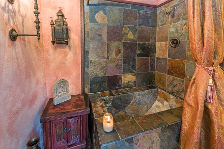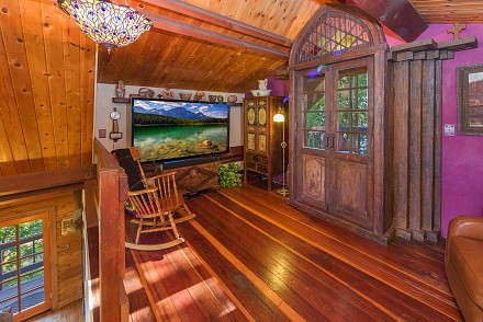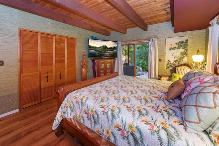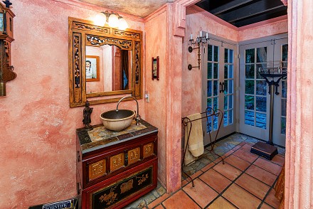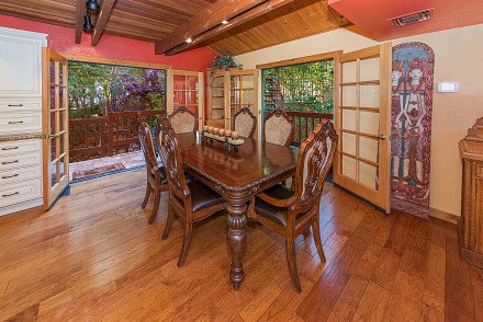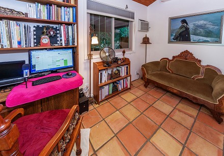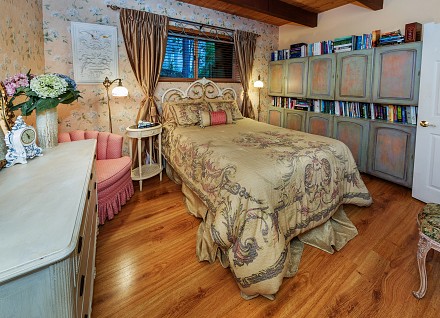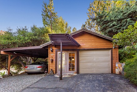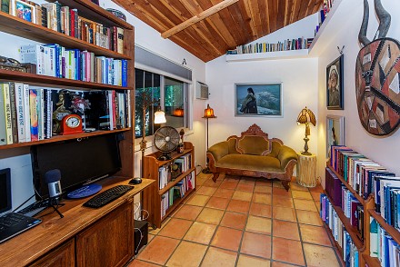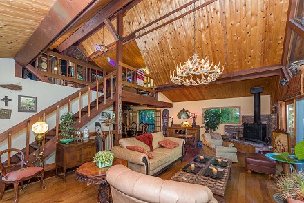 Envision a master bedroom, with wooden floors, open-beamed ceiling, and en suite bath, featuring a walk-in shower. Two other bedrooms have lovely views, sharing a bath with soaking tub. The loft features a magnificent imported door, which opens to another deck. The detached garage and carport also include a bright, spacious office, with a vaulted ceiling and Spanish tile flooring.