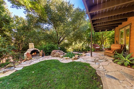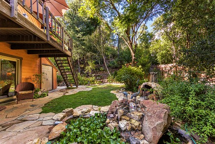 Envision a home surrounded by mountains, with a stone walkway ending at a hot tub, fire pit, and outdoor dining area. A spacious patio, with fountain, also has stairs going to the second floor of the home, offering even more majestic views.