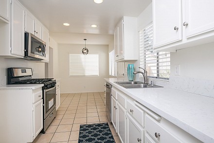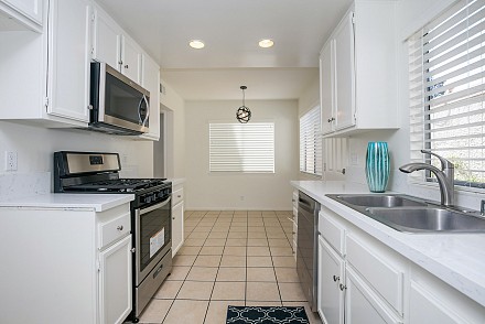 Light open Three plus two with two car garage. New flooring, new paint, new stone counters and new stainless steel appliances. two patios. Laundry room inside, breakfast room plus shared dining living. Upstairs master suite. Great location near pool