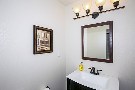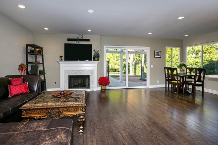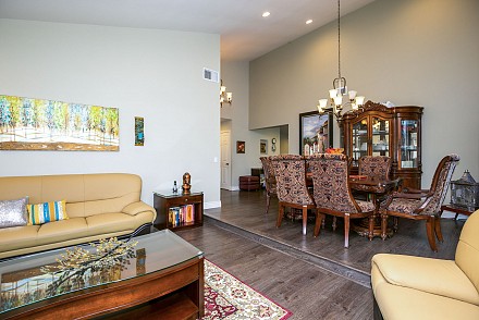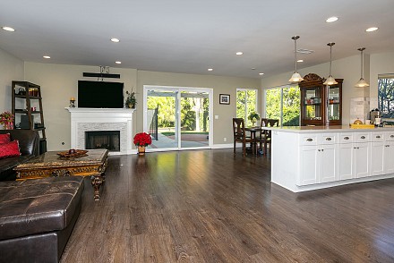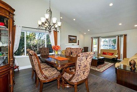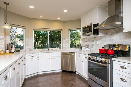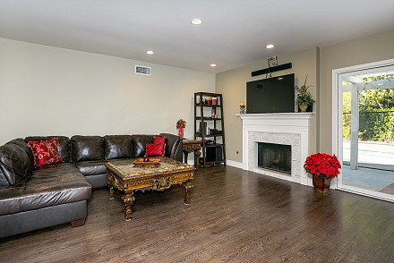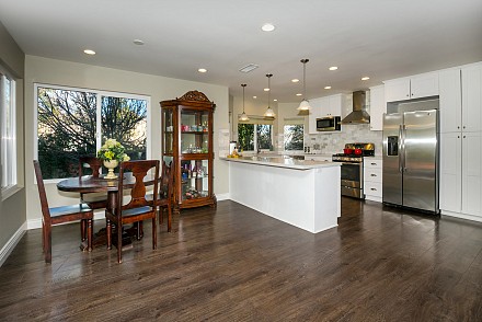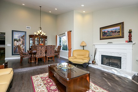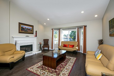The interior is move-in ready, especially with the deftly-upgraded kitchen and baths. The entire home features easy-to-maintain, yet equally beautifully wood-style, laminate flooring. The sprawling, open-floor plan in the family and kitchen is sparkling white, with sun spilling throughout. The spacious island and counters are highlighted with shimmering quartz, along with a marble backsplash, stainless appliances and charming breakfast area. An adjoining family room, with its white, wood and tile fireplace may be the ultimate, after-dinner relaxing spot. The more formal living and dining rooms, with fireplace, vaulted ceiling, and bay window afford ample room for gatherings.