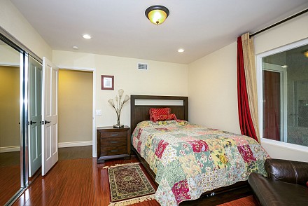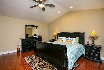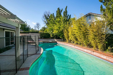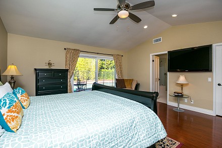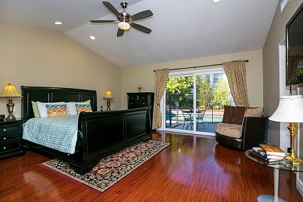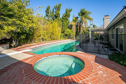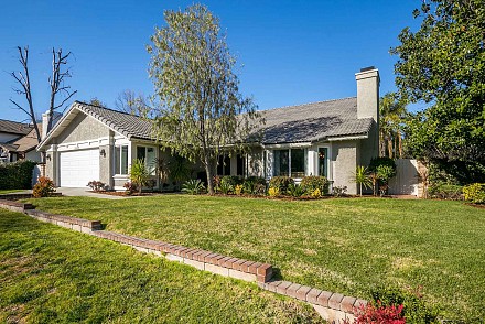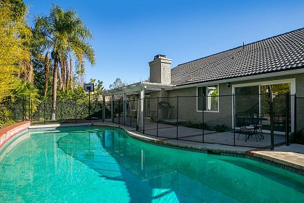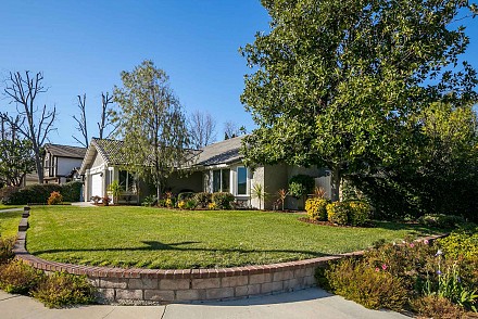 And this is definitely worth the journey… a rare Morrison Ranch, with 4 bedrooms and 3.5 baths. All on one floor on a sweeping corner lot, this property delights at every turn, beginning at the 2-car garage with bonus storage space, large, grassy front yard, with its low, stone wall winding around the front, to the backyard, replete with amenities: huge swimming pool which runs along the entire back of the house, relaxing spa, pergola-covered patio, and side yard, grassy/stone area with basketball hoop – proper California living!
