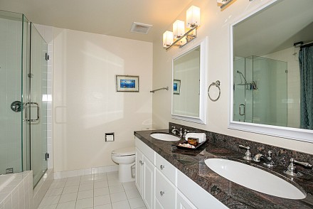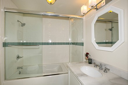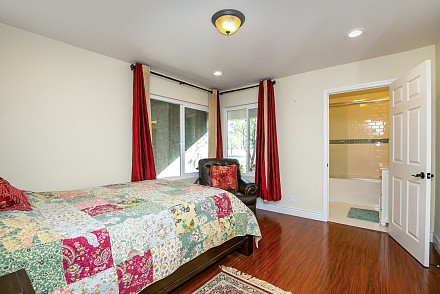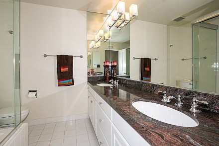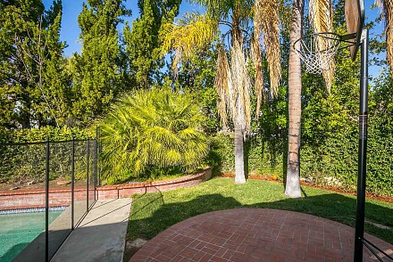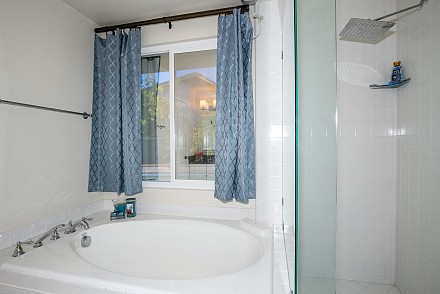 The master suite looks out to the pool, and its en suite bath is elegant, with soaking tub and expansive shower. Large trees and shrubbery along the perimeter of the back property makes this a private haven! A guest room has its own en suite, while the other two bedrooms share another bath.