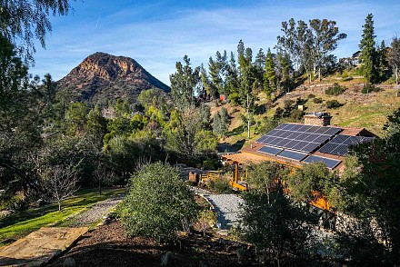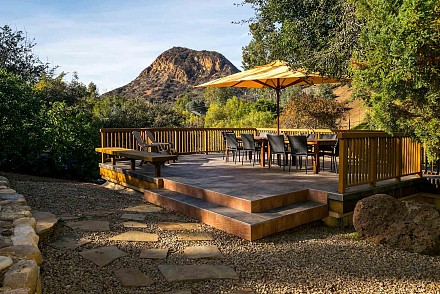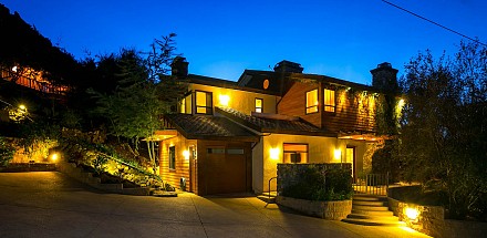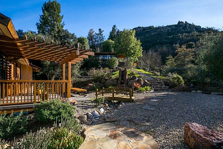 This custom-built estate of almost 3200 square feet has dazzling sights from every inch of the property, from the deck of the four-bedroom, four-bath main home to the the natural landscape of rock formations, waterfalls, and winding pathways, marries beautifully with the surrounding hills and trees. Everywhere you look, there is something to delight the senses: the backyard raised deck, with tiled floor – perfect for dancing and entertaining; a brook, with its tiny bridge; landscape lighting which illuminates the yard