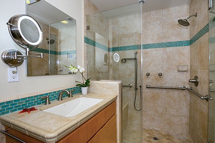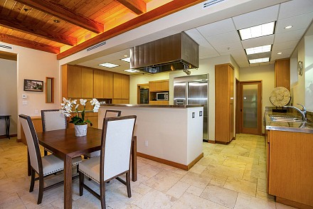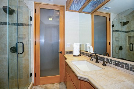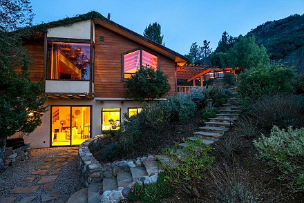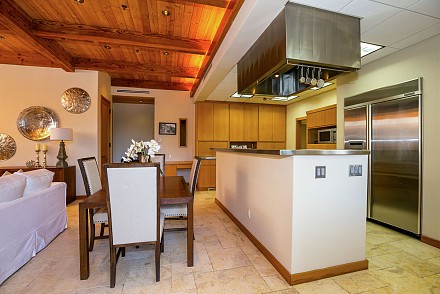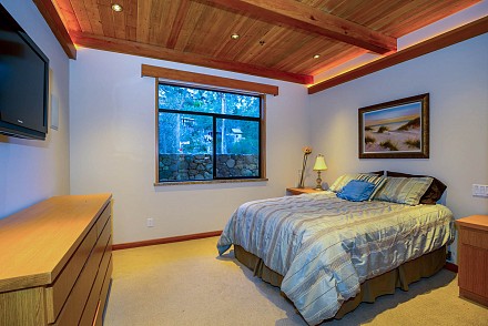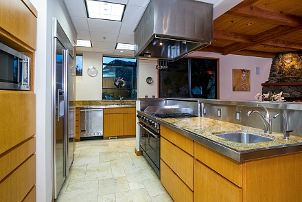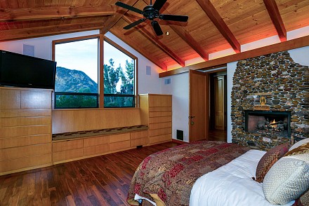 On the upper level, all of the floors are African walnut. A guest bedroom, with its en suite bath, has a lovely fireplace and private deck. The master suite, with beamed ceiling, fireplace, is serene and elegant. The scene from the bed out the window looks like you’re in the Swiss Alps! An en suite bath has a large steam shower, soaking tub, and many built-ins.