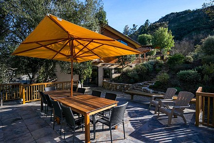 A striking front door opens to the first level of the main house, which has travertine flooring throughout. Highlighting the elegant living room – a rock fireplace that extends across one wall, and a stunning beamed ceiling. The dining area and kitchen also open to the living area, featuring granite counters, chef stove, stainless appliances, large island, and adjacent laundry room. Also on this level are two guest rooms and two upgraded, full baths. The studio, with its wraparound deck offers more jaw-dropping vistas.