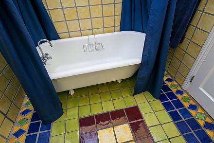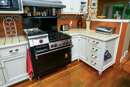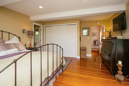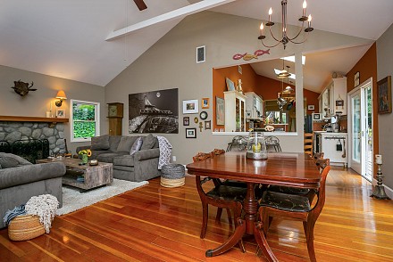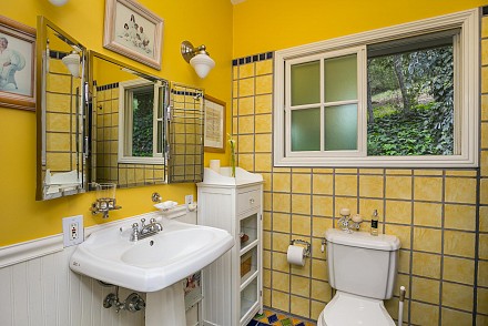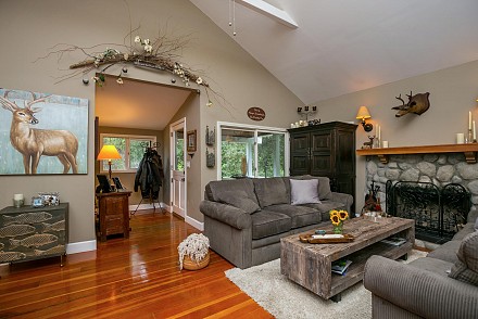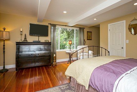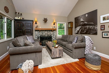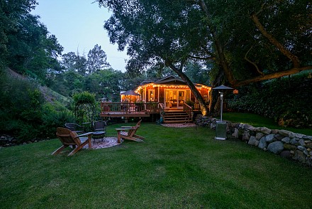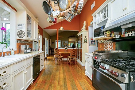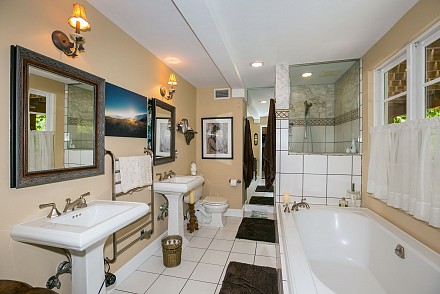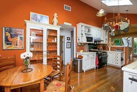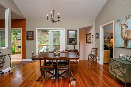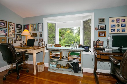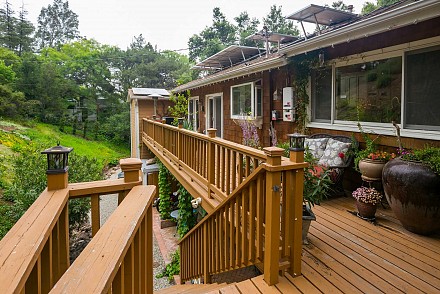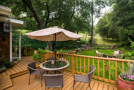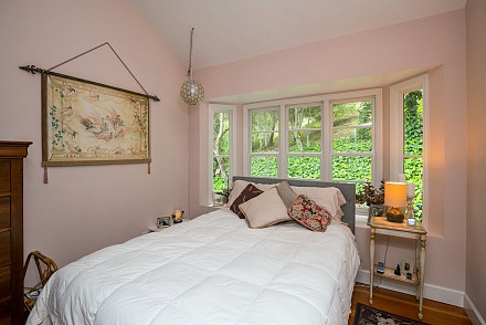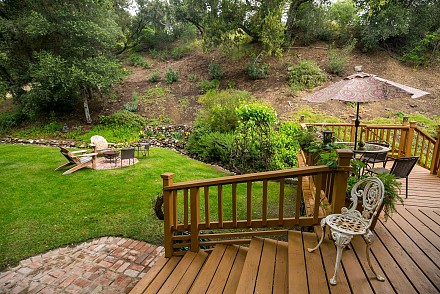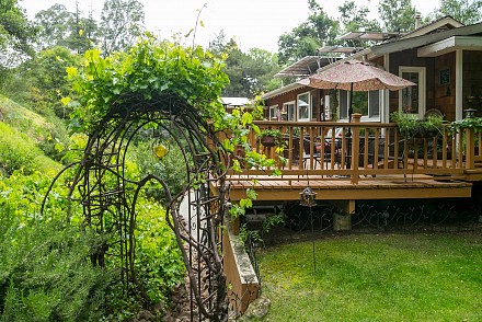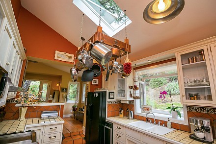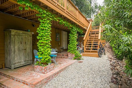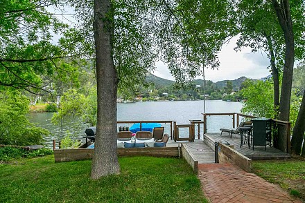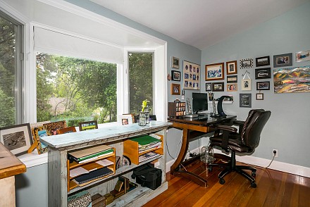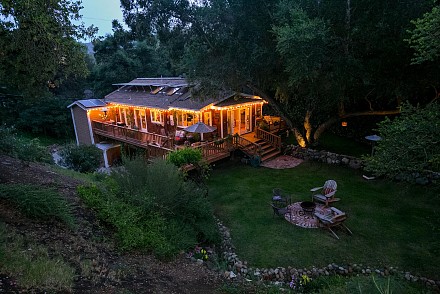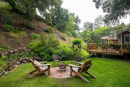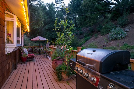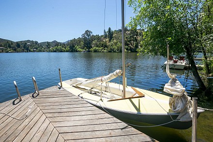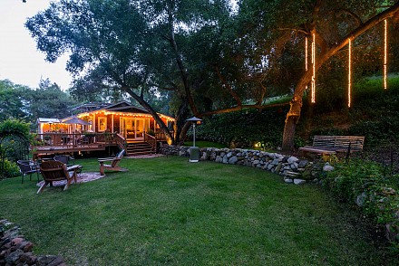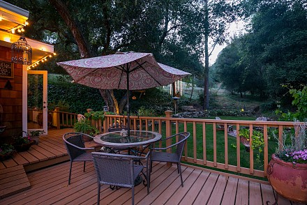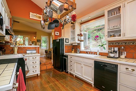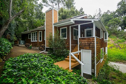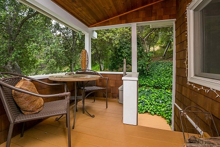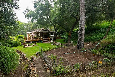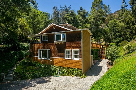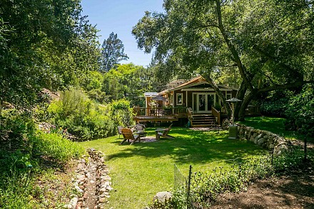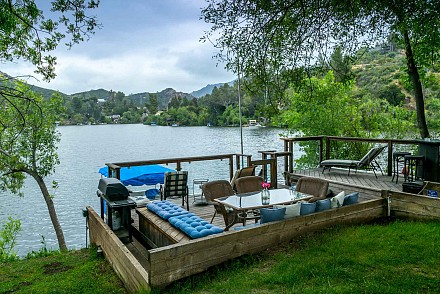 The bungalow is nestled in a valley surrounded by the Santa Monica Mountains, with trees and lush greenery rivaling a bucket of emeralds! The premier site, with its stacked-stone garden walls, cozy sitting areas, and large, 2-level dock, will have you hosting every 4th of July for years. Be sure to show off the classic 1920’s photograph, which featured this iconic, shingle-siding Craftsman home. A charming Dutch-door opens to the living room on the second level, replete with stunning wide-plank, pine flooring, vaulted ceiling, and stone fireplace. All of the lower level and most of the upper level boasts this handsome wood. Encircling this level is a huge deck, offering lovely garden views. Adjacent is an office, whose bay window opens to even more vistas. The kitchen, with pristine white cabinetry, breakfast area, and two large skylights is bright and welcoming, highlighted by a gorgeous Wolf range, with its “ruby” red knobs! A dining room lies on one side of the kitchen and on the other end a paver-tiled family room, with French doors leading to the deck and some massive oak trees. The guest bedroom, with its built-in wardrobe and window seat set into a large bay window, hosts an adjoining bathroom, with colorful “sapphire” Spanish tile-work and striking clawfoot tub – another jewel in this property.