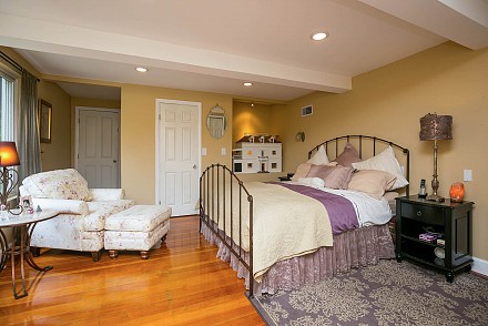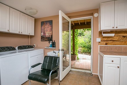 A master bedroom is on the first level and features an exterior entrance, two closets, an updated ensuite bath, with heated towel racks, separate shower and tub, and double vanity. A utility room on the first level has been nicely renovated and used as a hairstylist’s work station. The white cabinetry and paver floors offers much potential: game/exercise room included is a laundry area.