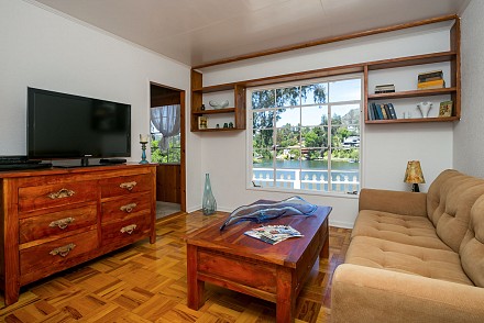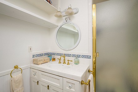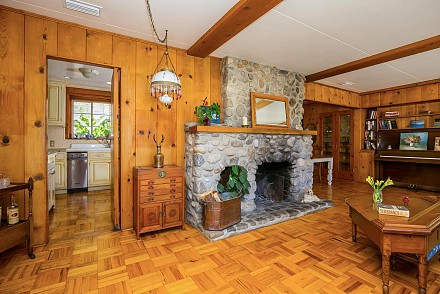 It is now time for other owners to create their own memories, to add their own magic, and there is no better spot to do that than in the yellow cottage on the banks of Malibou Lake. The single level, 3- bedroom, 2.5 bath house, sits on a high knoll, with commanding views of the Santa Monica Mountains, Malibou Lake and island. A wraparound deck on the front and sides of the home gives even more majestic views. That, along with a covered lounge and covered dock offers three wonderful entertaining areas. Inside, a huge stone fireplace is the centerpiece of the living room, just waiting for someone to hunch over the logs with a marshmallow on a stick! The floors are a rich parquet, which fit in beautifully with the open-beamed ceiling and knotty pine walls. Of course, there are views from every room, with an abundance of windows creating a rich, sun-filled atmosphere. Adjacent to the living and dining area is the updated chef’s kitchen, with granite counters, stainless appliances, and custom cabinetry.