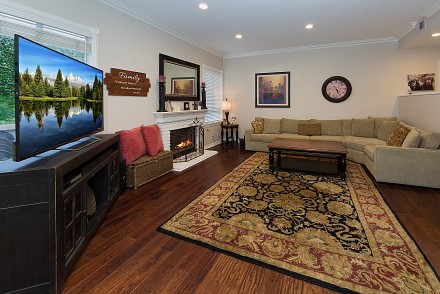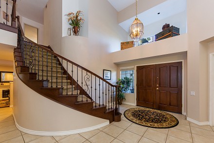 The interior of the home is equally impressive. Pristine landscaping leads to a double-door, front entry, with vaulted ceiling and a “showstopper” winding staircase in rich, dark wood. The living room, with gorgeous distressed wood floors and fireplace, has French doors opening to the patio. The spacious family room also has a fireplace and pool views.