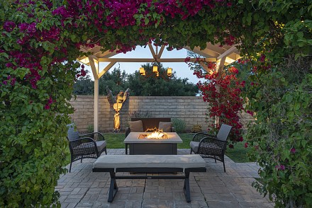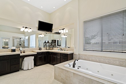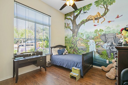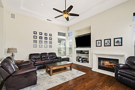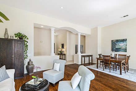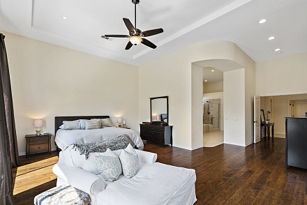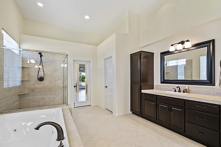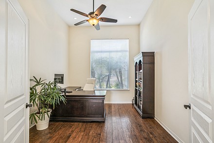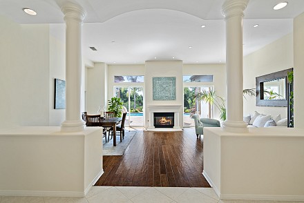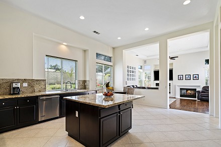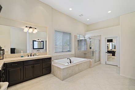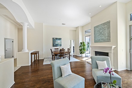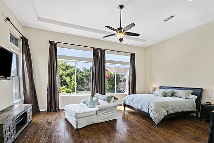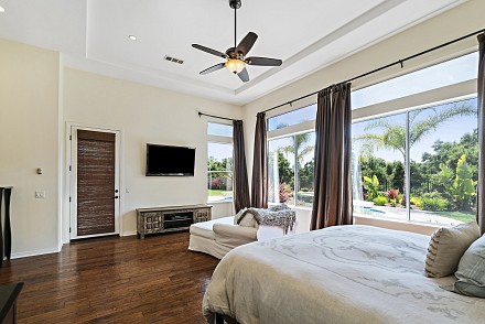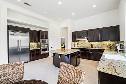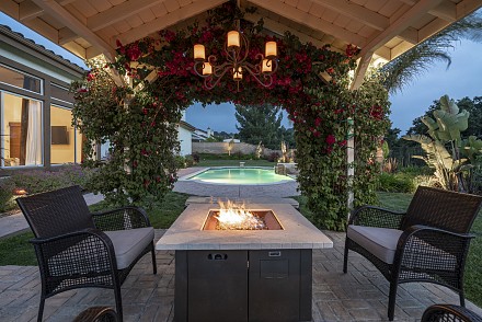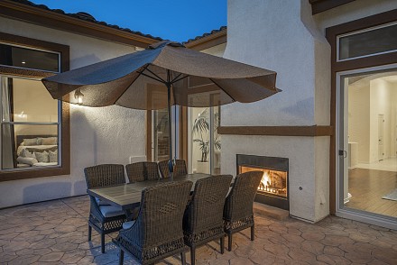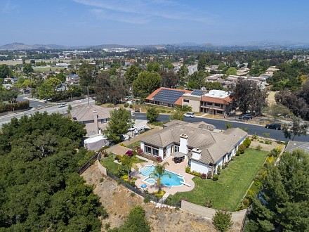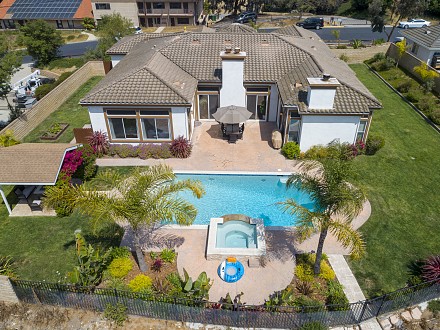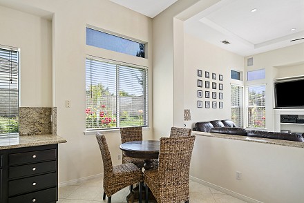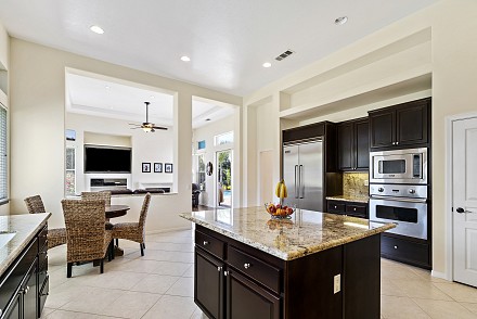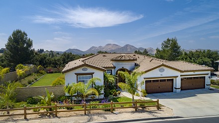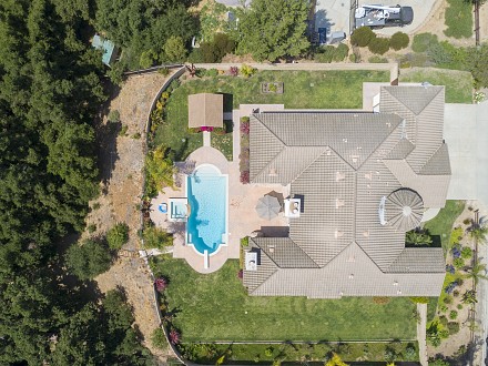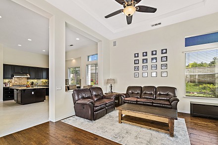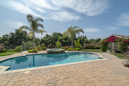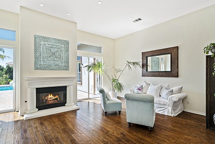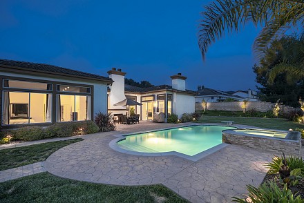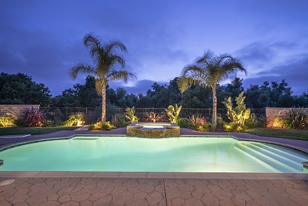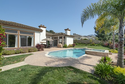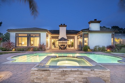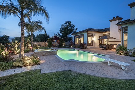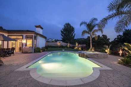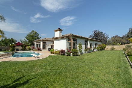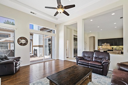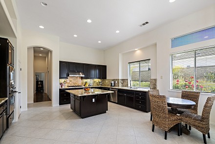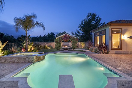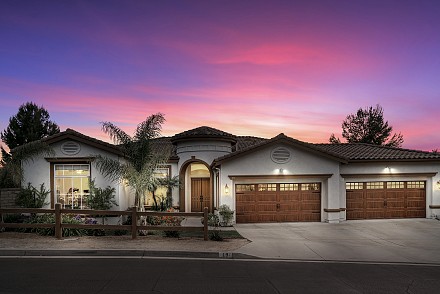 Soaring 12' foot ceilings throughout this magnificent single story allowing for maximum light. The ultimate backyard with cabana, saltwater pool, spa, lush expansive lawn, backing an Oak tree arroyo w/ perfect privacy. Over 3200 sq. ft and set on nearly 1/2 acre. Kitchen opens to large family room and features stainless steel appliances, granite counters, center island, and walk-in pantry. Fireplaces are located in family, living and courtyard area of yard. Premiere master retreat w/exterior entrance to yard, huge walk-in, sitting area separate tub and shower and vanity space galore. Dark wood floors in bedrooms, living room and office. Spacious 4 car garage with added built-in storage. gated community and easy access to the 101.