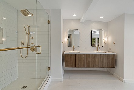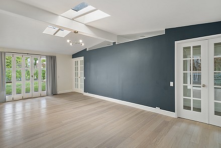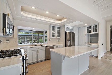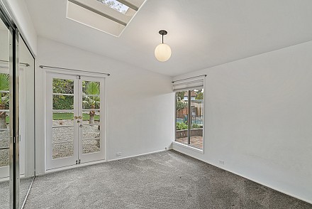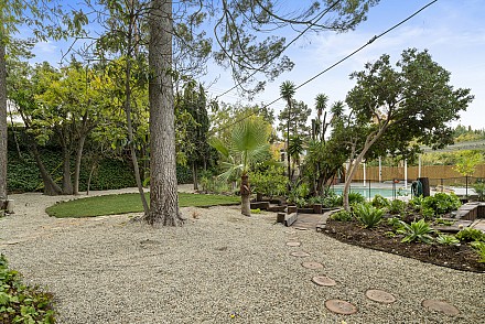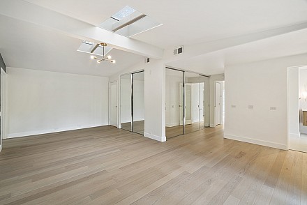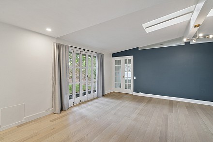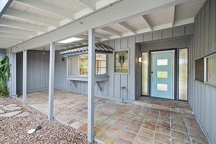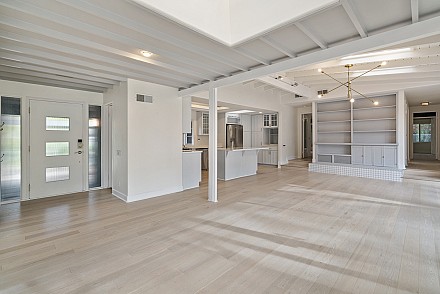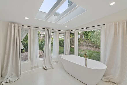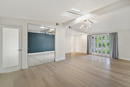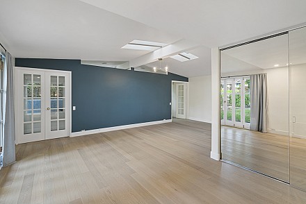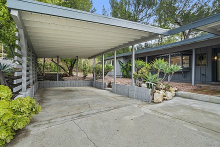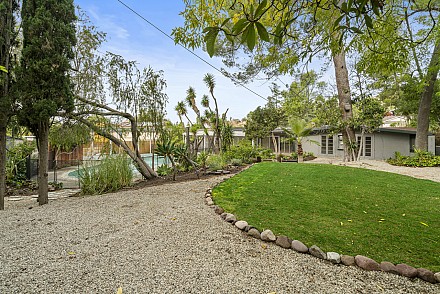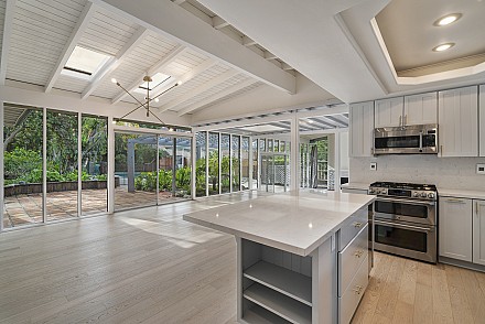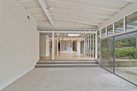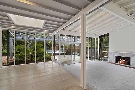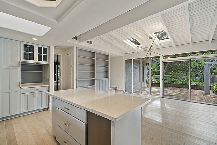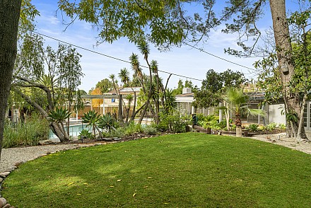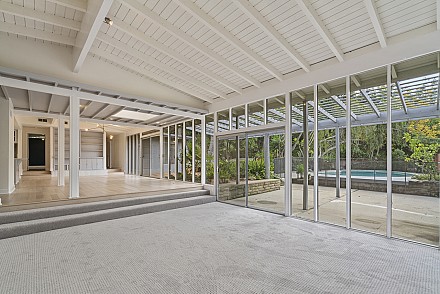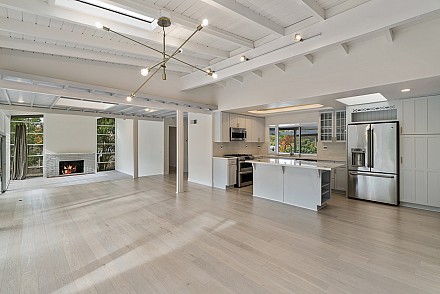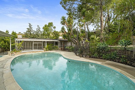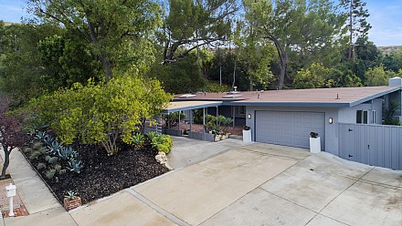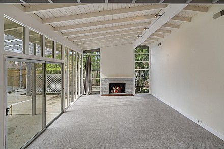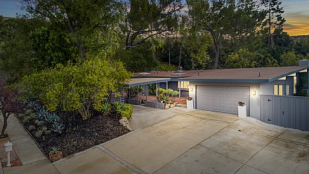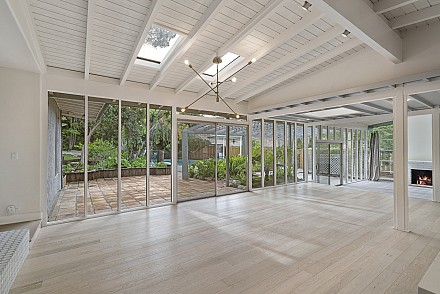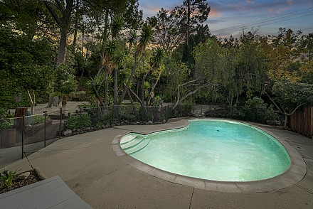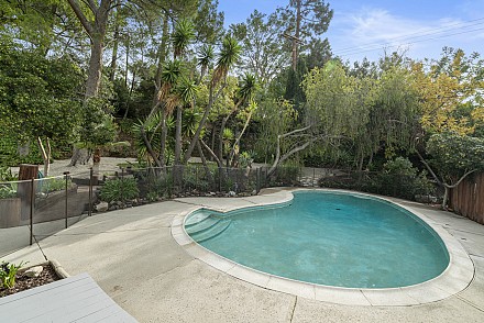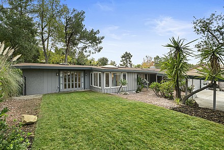 Situated beautifully on one of the neighborhood's largest lots, this one-of-a-kind, mid-century architectural ranch designed by Cliff May, showcases floor to ceiling windows and open floor plan, allowing for plenty of natural light. High ceilings, recessed lighting and brand new Kahrs hardwood flooring. Step down into living space, with fireplace. Kitchen boasts stainless appliances, Caesarstone quartz counter tops and center island, while opening to dining and living spaces. Master suite includes skylights and walk-in closet. Newly remodeled master bath, featuring sunken tub, shower stall and dual sinks. Additional three bedrooms, 2 full baths and powder room. Converted garage to a 4th living area or office with full bath and laundry area. Outside to find sparkling pool, beautifully landscaped grassy area, herb garden, sitting areas and pool cabana. 1960s architecture meets modern living...a true masterpiece.